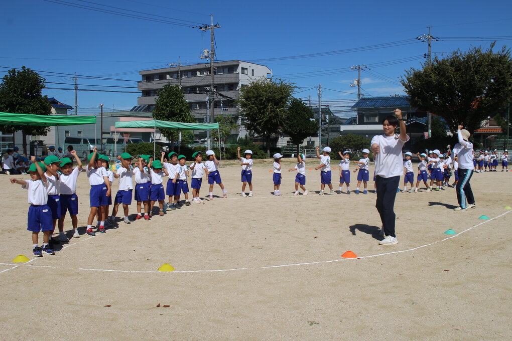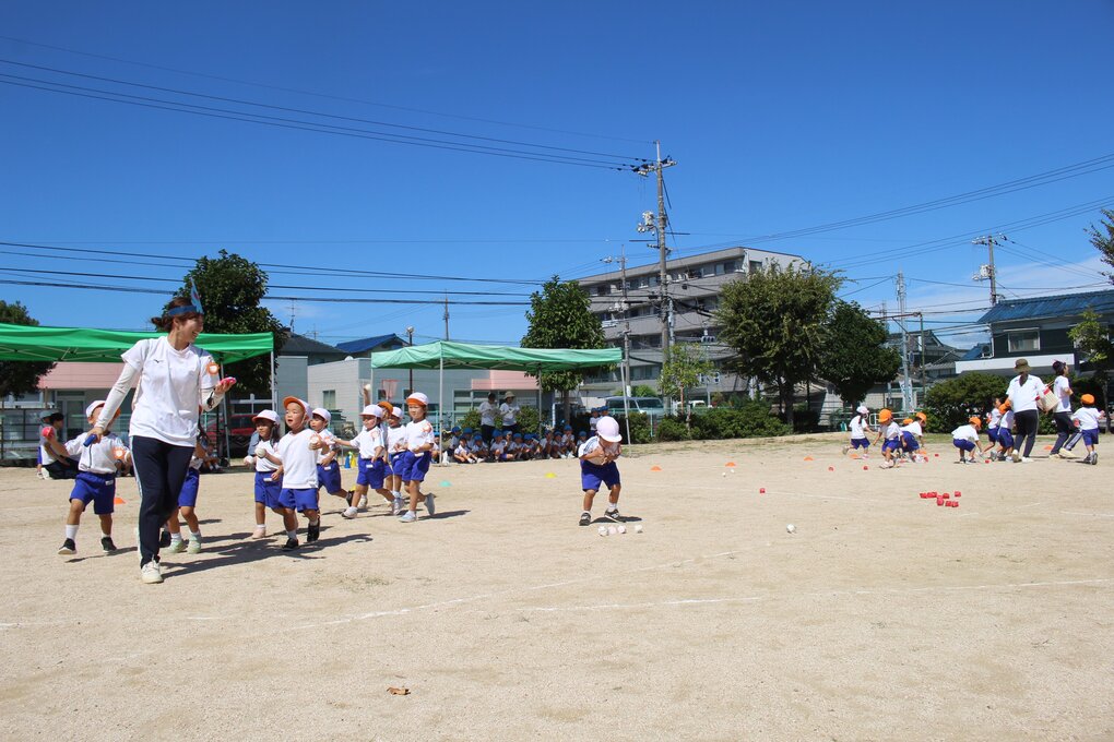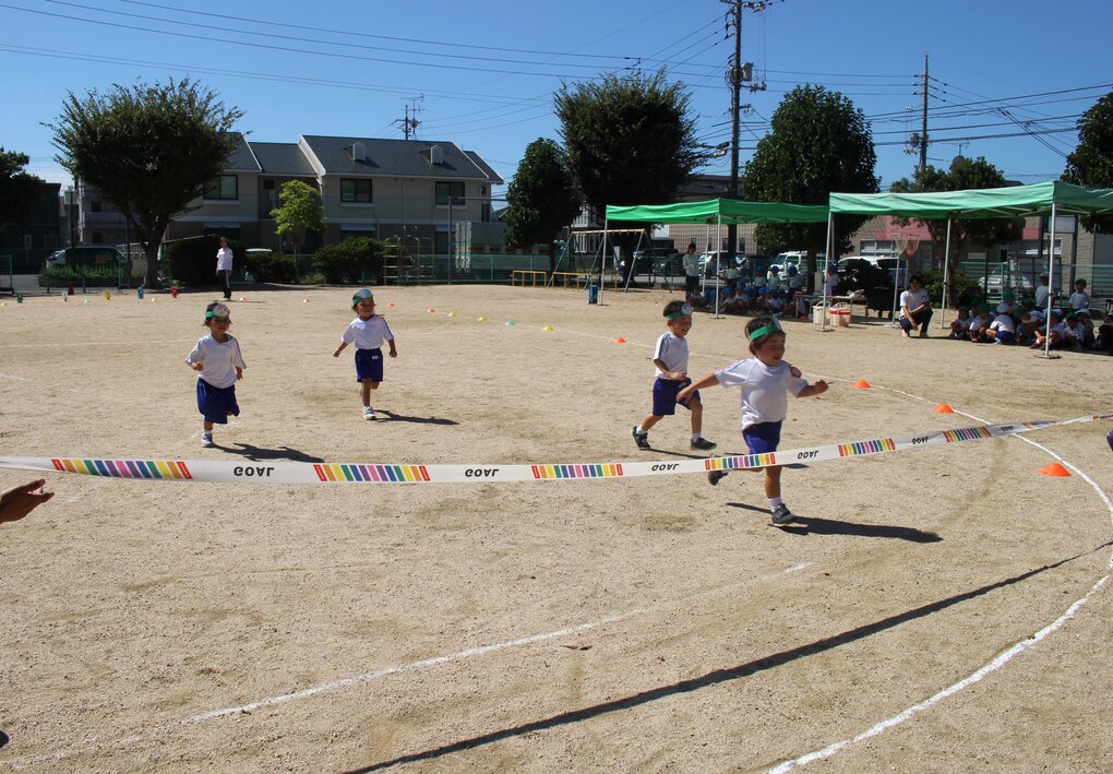 3歳児クラスははじめてのスポフェス。この日は全員ペンギンに変身して、それぞれの種目を思いっきり楽しんでいる姿がとても可愛くて印象的でした。また、出番を待っている間も「○○組さん、がんばれ~!」「〇色を応援しよう!」 と、お兄さんやお姉さんを応援する声がたくさん聞かれました。スポフェスでは3歳児らしく、皆で直線を思いっきり走ったり、異年齢で体を大きく使って表現したりすることを楽しんでほしいと思います。