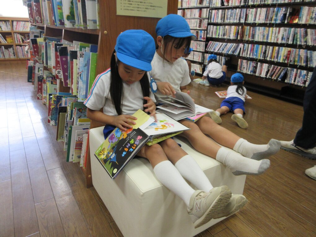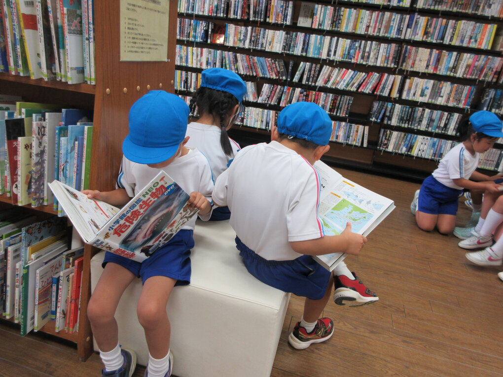 公民館の先生に「おはようございます!」とあいさつした後、子ども達は館内にある図書室で自分の好きな絵本や図鑑を読ませていただきました。図書室では約30分間、じっくりと1人で静かに絵本や図鑑を読んだり、友達同士で見合ったりする姿が見られました。公民館は一般の人も利用する地域の大切な場所ということもよく理解できているようです。
