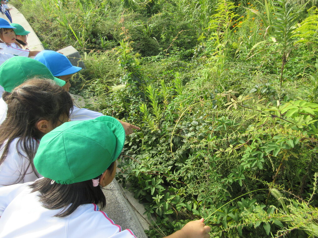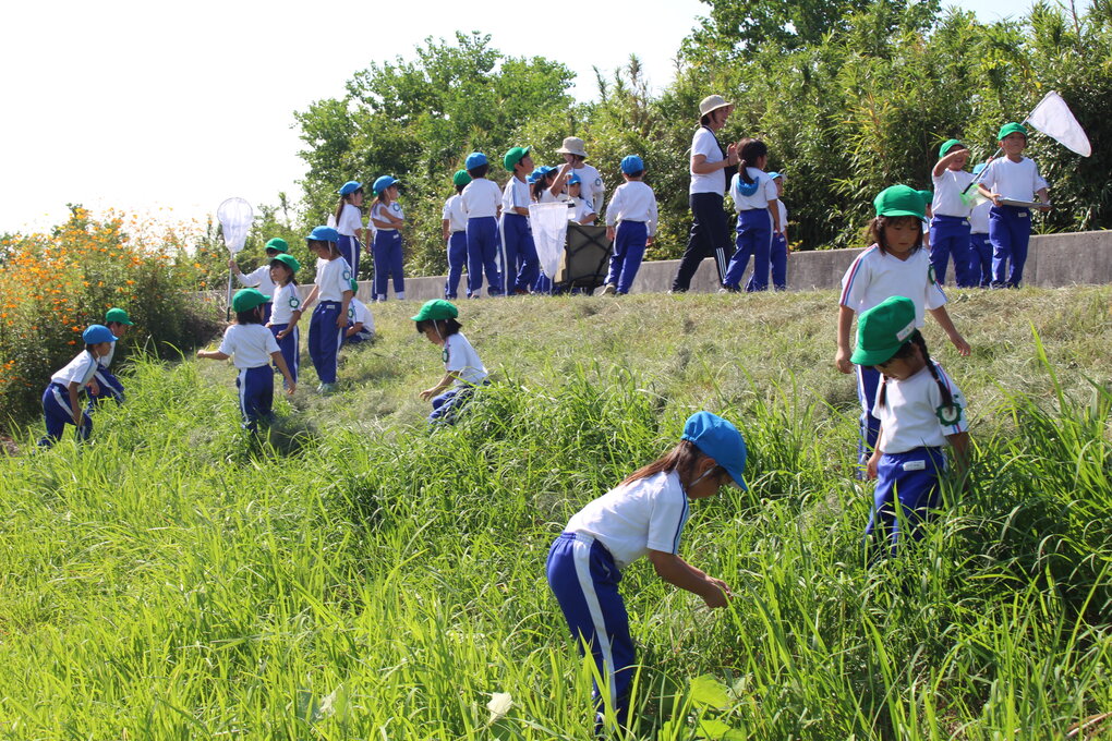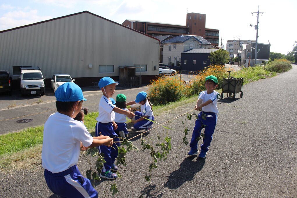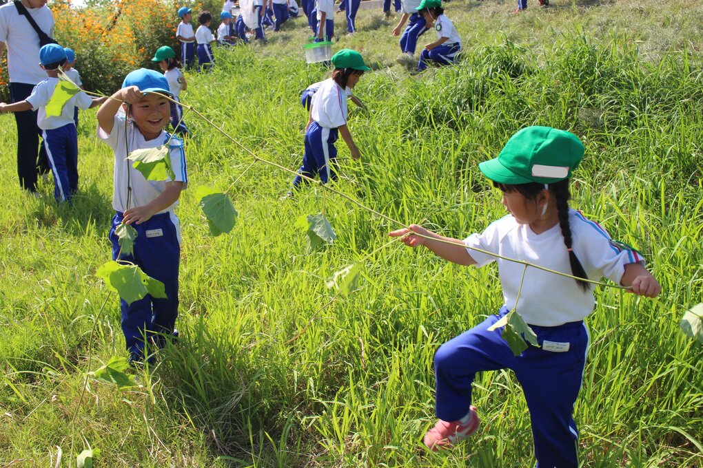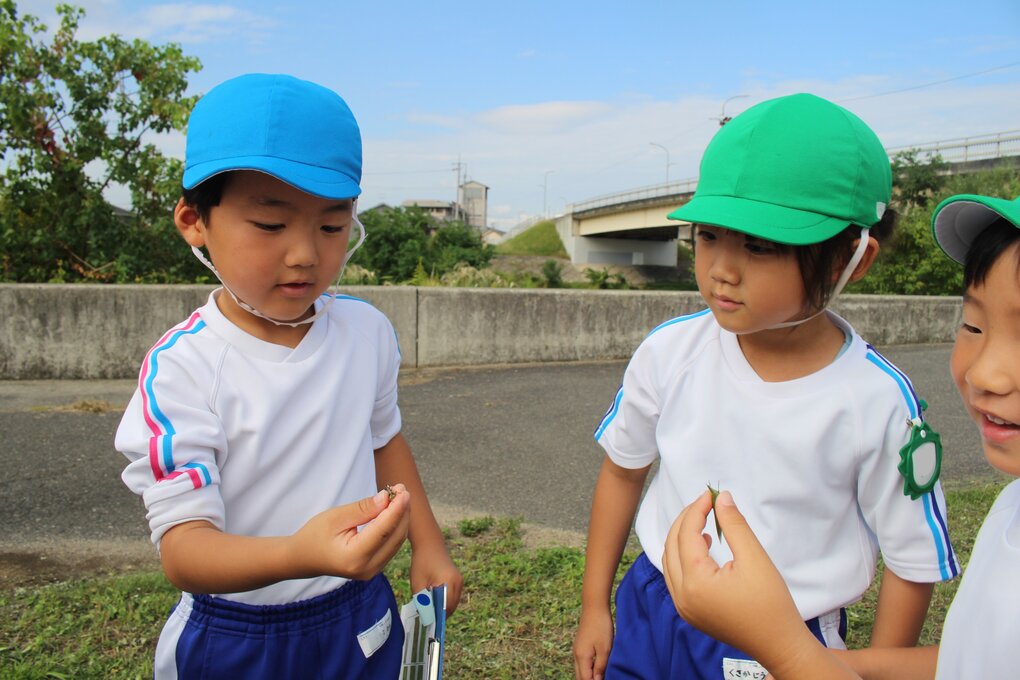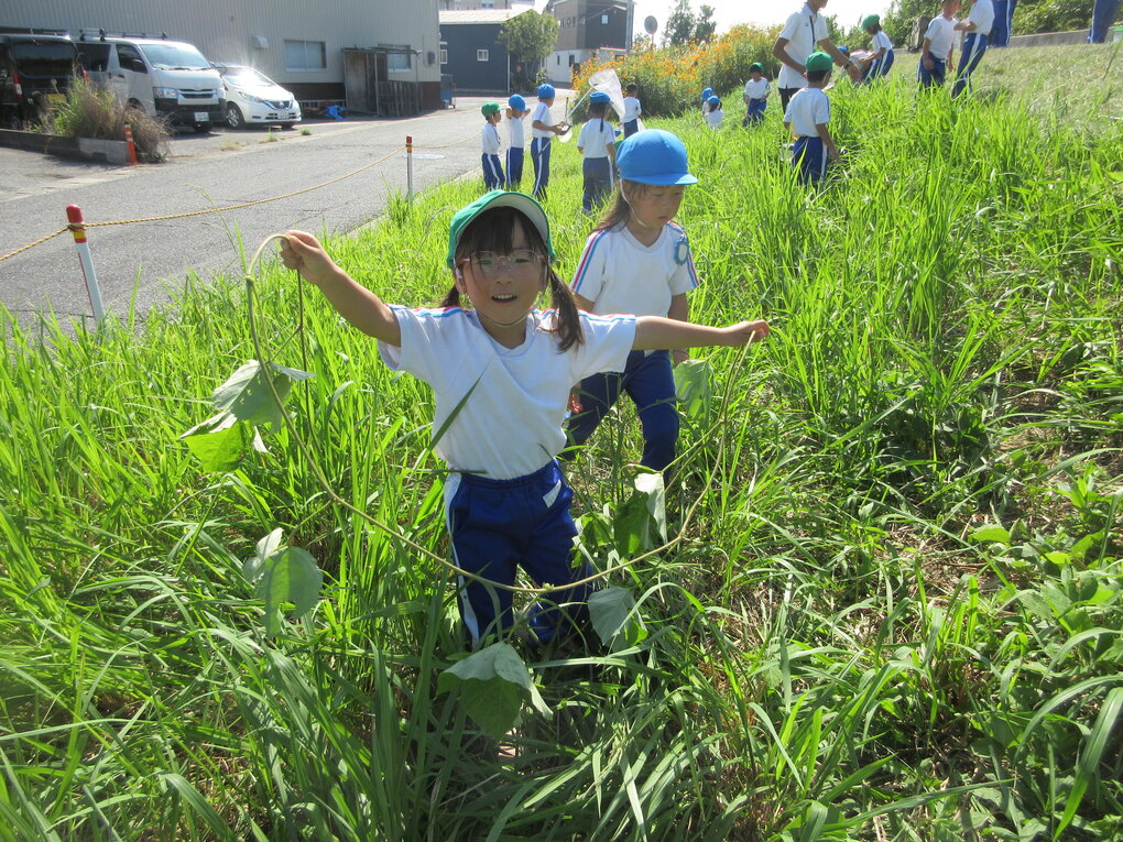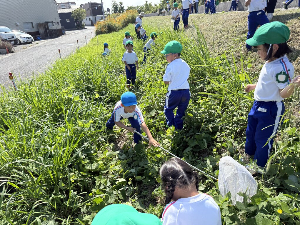 職員で事前に下見をした際に決めておいたフィールドで、ショウリョウバッタやキリギリス、シジミチョウやコオロギを捕まえることができました。今年は特にショウリョウバッタを見つけた子が多かったように思います。また、子ども達の想像力は虫探しの域を超えてクズのツタで綱引きをしたり、草の斜面を使って滑り台を楽しんだり、遊びを自分達で生み出して楽しむ姿が見られました。