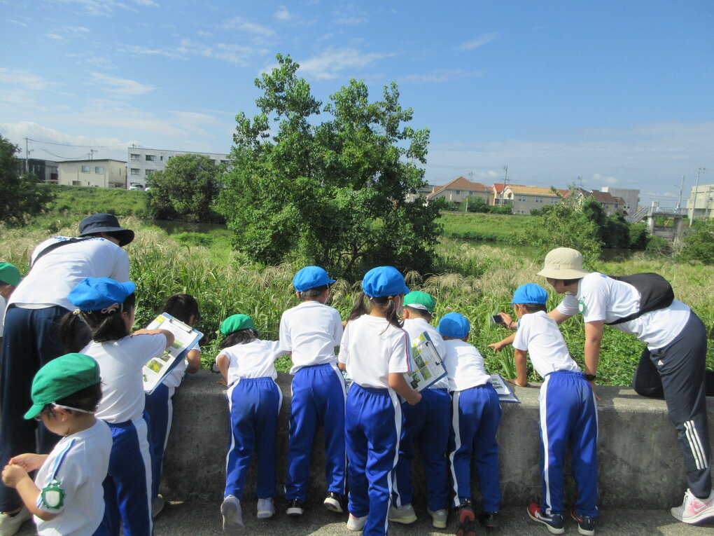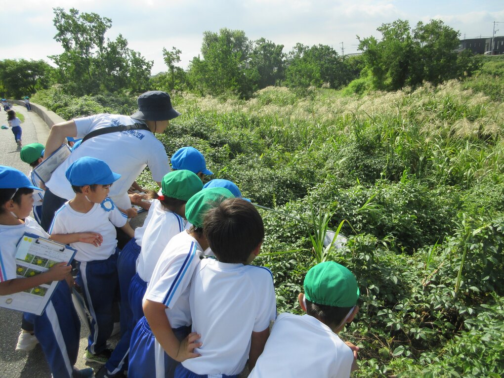 ほぼ全てのペアが9つのお題をクリアし、さらに、この日の笹ヶ瀬川で見つけた『素敵だな!面白いな!』と思ったものを各々でシートに貼ってビンゴゲームが終了。途中から太陽が照って暑くなってきたので水分補給をして、最後はお待ちかねの虫探しタイム!