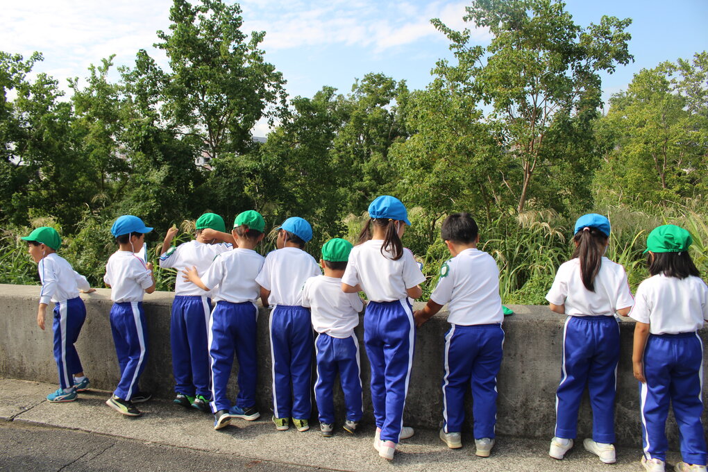 10月8日(水)、4・5歳児クラス合同で笹ヶ瀬川プロジェクトmixを行いました。子ども達は異年齢でペアになって5歳児が4歳児をサポートしながら笹ヶ瀬川に到着。いつもの階段に座ってまずは秋の空気を体内に思いっきり吸い込んで深呼吸。うろこ雲を眺めながら「秋の味がする」と教えてくれた子もいました。
