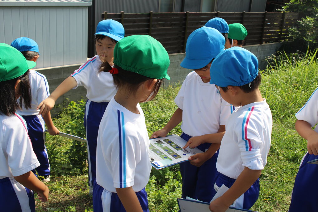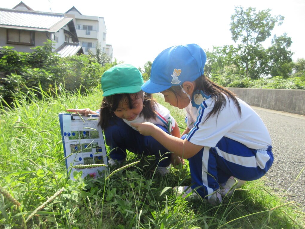 その後、異年齢のペアで笹ヶ瀬川ビンゴゲームがスタート。9つのお題(写真)を手掛かりに、身近な植物や生き物を探しまくります。すぐに見つかるもの(ヨモギやエノコログサ)から難しいもの(トンボやカマキリ)まで、根気強く協力しながら見つけていく子ども達。時にはAペア「どこにもいないよ~」、Bペア「あっちにいたよ!一緒に行って探してみようよ」など、ペア同士で声を掛け合い助け合いながら探す姿も見られ、mixならではの関わりの中で微笑ましい光景が見られました。