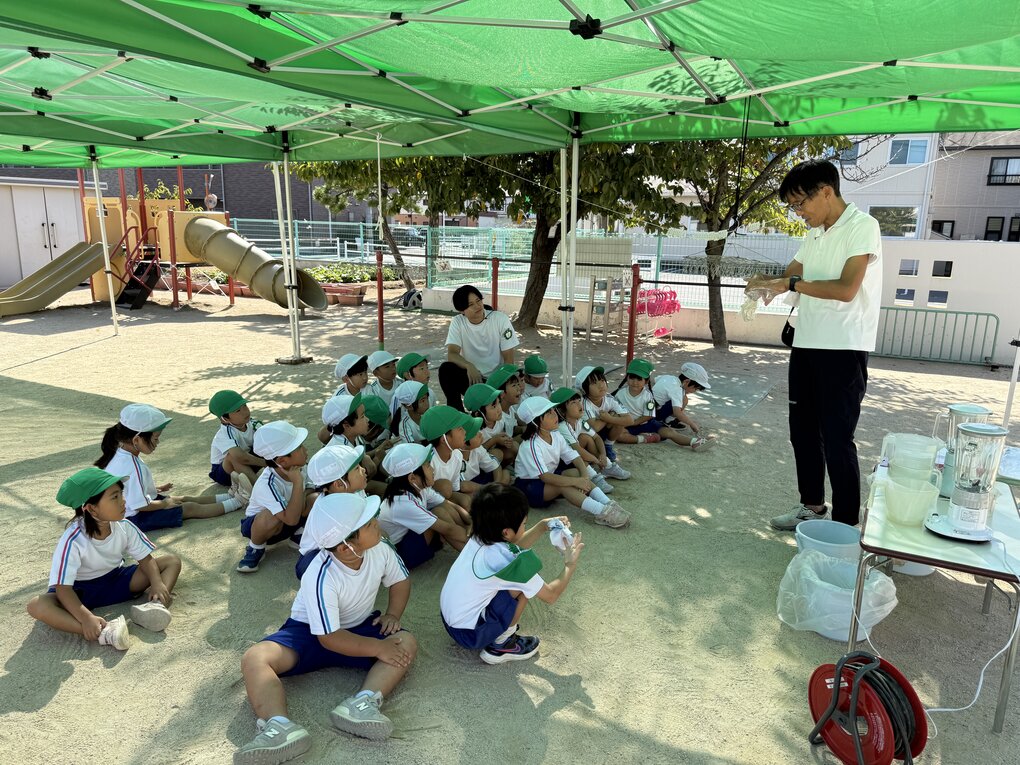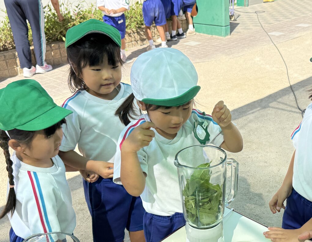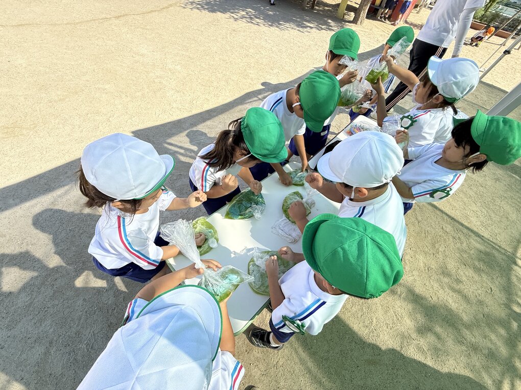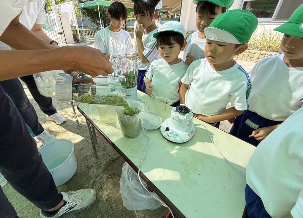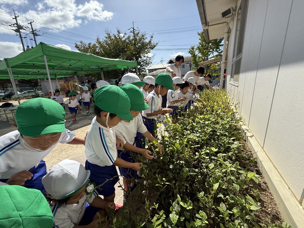 10月9日(木)、4歳児クラスの子ども達が園で栽培している徳島の藍の葉を使って生葉染め体験をしました。とはいっても今回は自分たちで育てた藍ではなく、姉妹園の御南認定こども園で育ててもらっている藍(タデ科)を使用させていただきました。(詳細は9月2日の御南認定こども園のブログを参照ください)