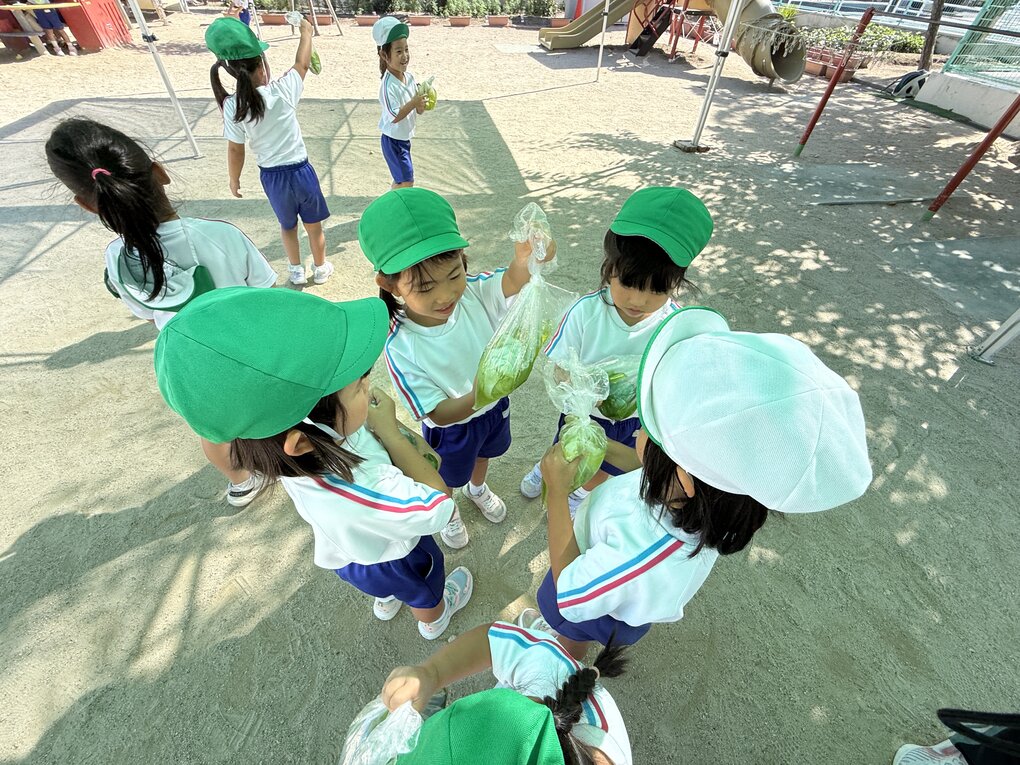 急に朝夕が秋らしくなって、保育活動も徐々に元気さや明るさから、美しさや感性に響く保育内容に移り変わっていきます。春から色々な草木染めに親しんできた子ども達。同じ藍染めでも藍の種類や染める材料、染め方によって色や表情が全然違うこと、それでも藍は緑の葉から青色が出る不思議な植物であることを改めて体験から学ぶことができました。今回、貴重な藍の葉を分けてくださった御南認定こども園に感謝申し上げます。来年も園で育てた藍で生葉染めができますように。