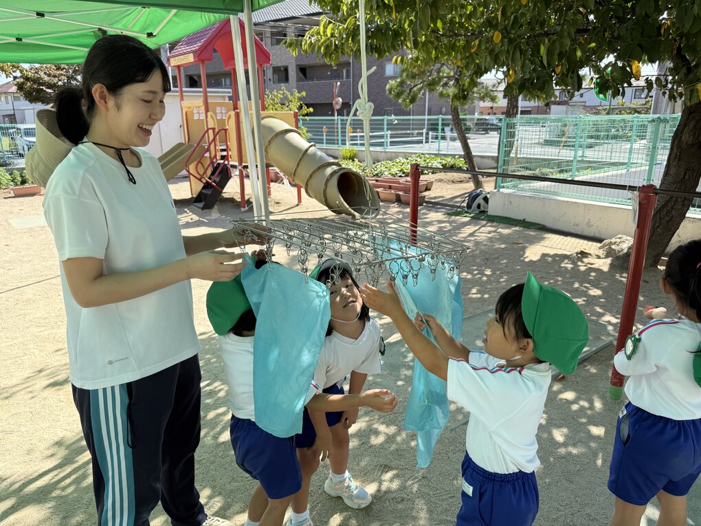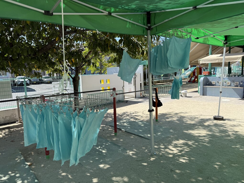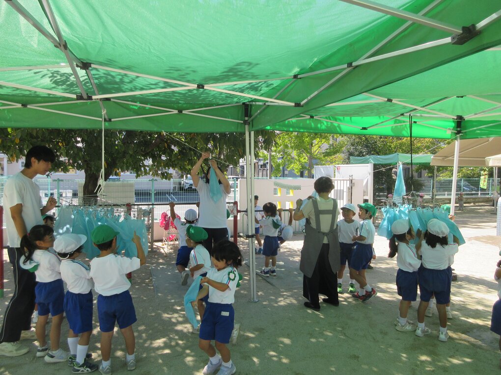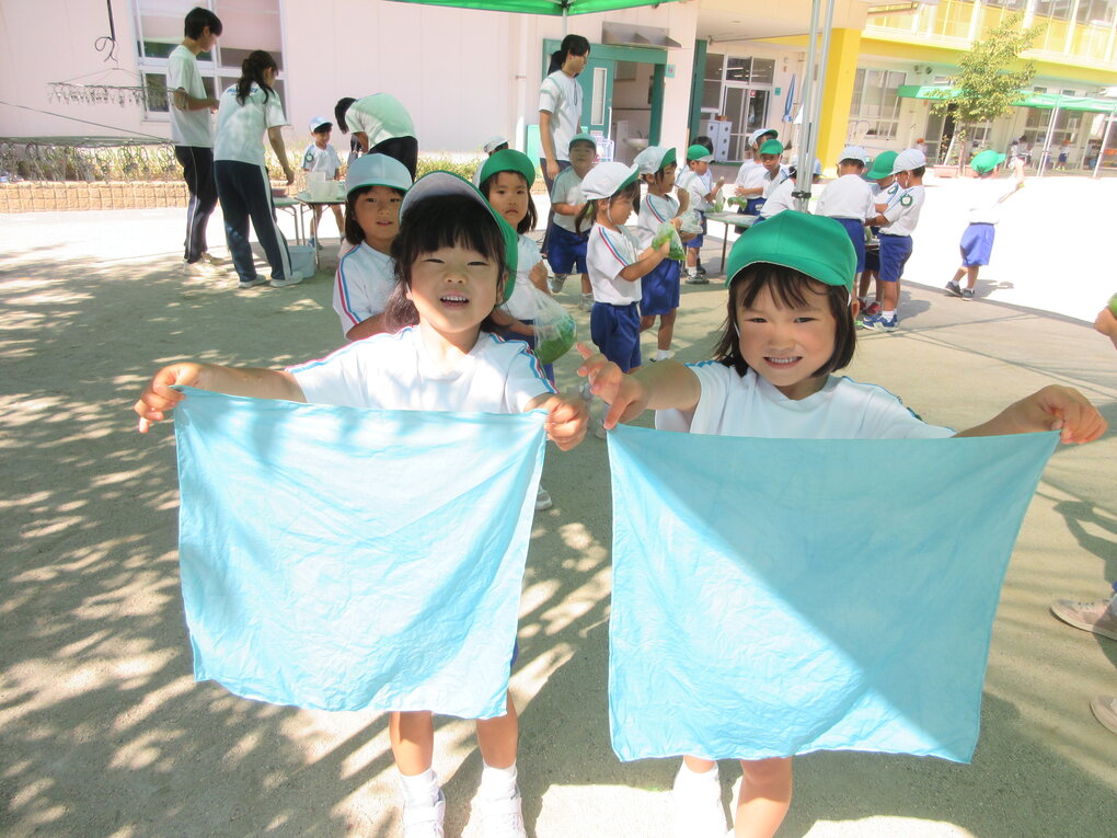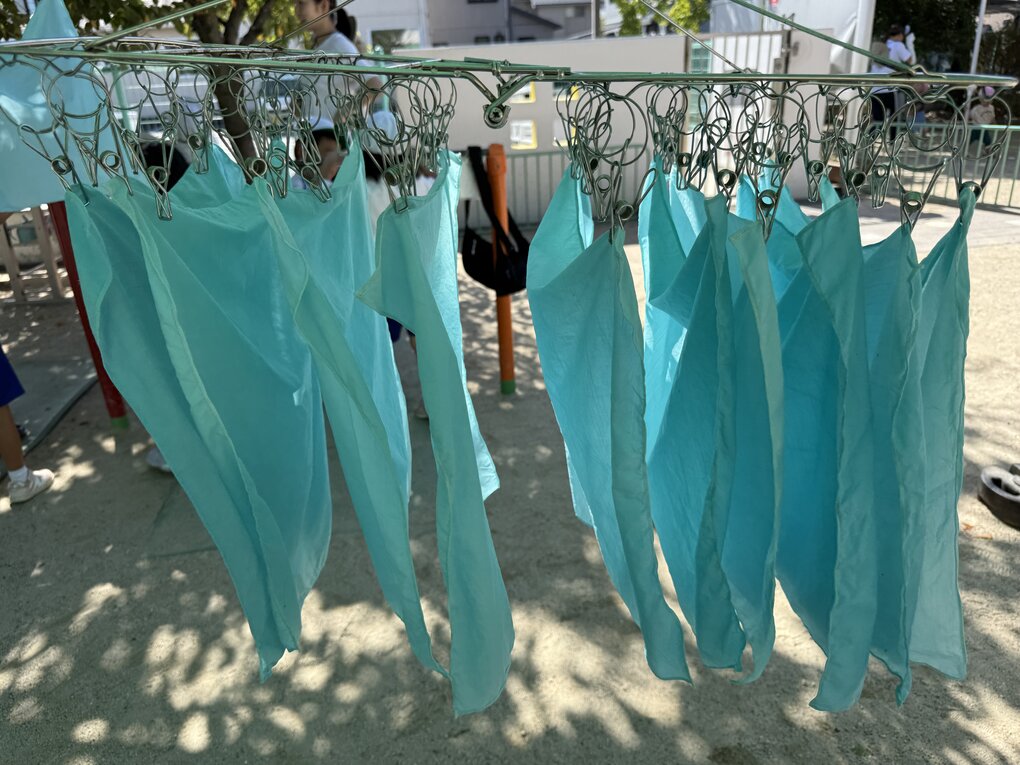 その後、ナイロンを解き、流水で洗うと、見たこともない美しい空色のハンカチが完成!今回は時期も遅かったせいか生葉の量は少なめでしたが、染ムラを防ぐために水分量を多くしたことで、どの子も殆どムラなく美しく染めることができました。 ハンカチを干してみると、1枚よりもより色の美しさや彩やかさが際立って見えました。その後、子ども達は認定こども園の先生にお茶とお菓子を出してもらって大喜び!お礼を言って、園庭の遊具で少し遊ばせてもらってからまんまる園に帰りました。