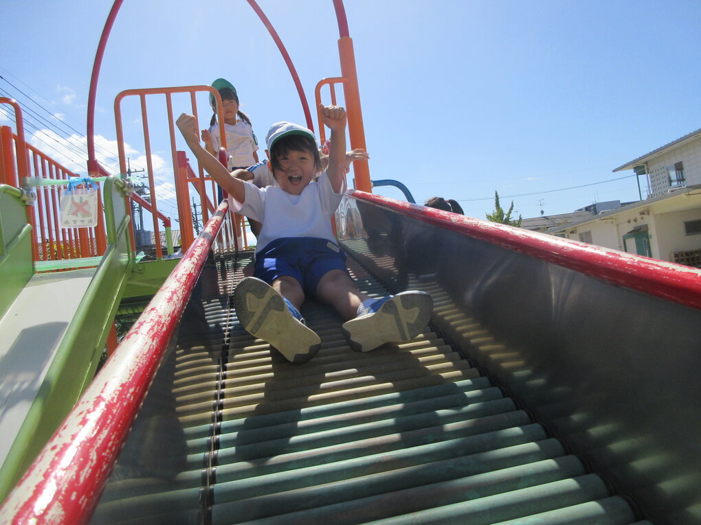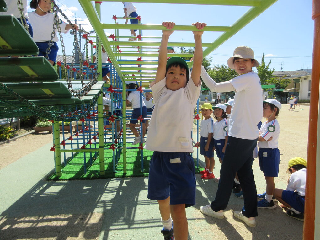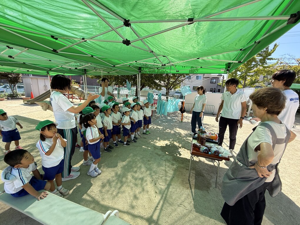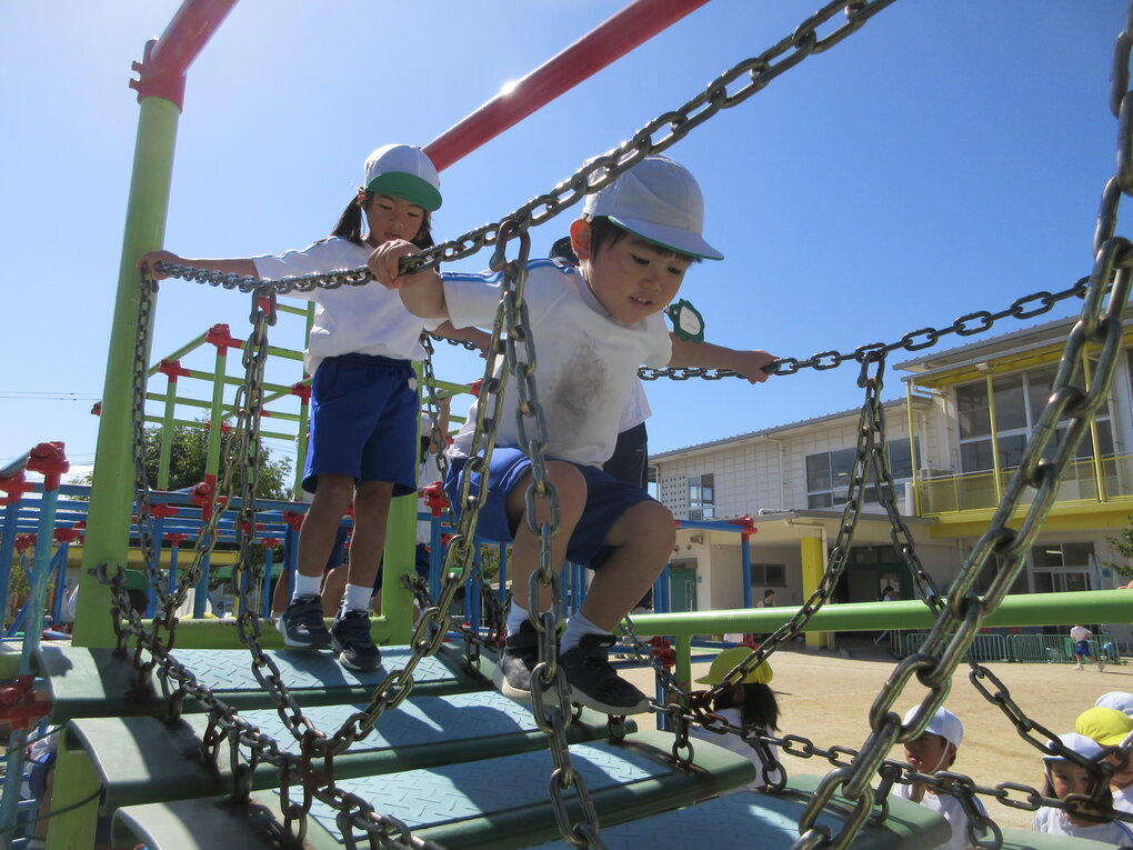 園に到着すると、丁度5歳児クラスが園庭で迫力のある走り跳びをしていました。それを見て『走りたい欲求』が止まらなくなった子ども達…。急遽縄を借りて走り跳びをさせてもらいました。場所が変われば、いつもの走り跳びのスピードも面白さも倍増して認定こども園の先生たちもビックリ。いっぱい褒めてもらって嬉しい子ども達でした。