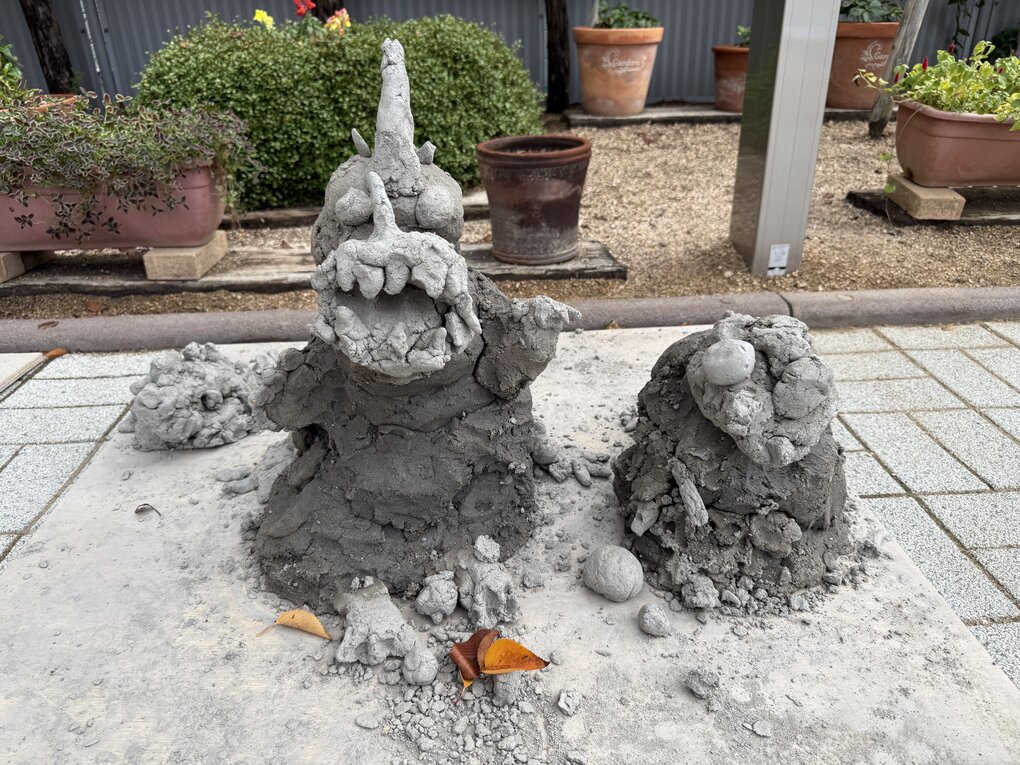 完成した作品は暫く園内に飾り、その後は子ども達と壊して一度粉々にします。年が明けたら、またそれを粘土として再生して、今度は個人で粘土作品制作し、野焼きにします。遠い昔、人間が生きる為に獲得した知恵と技術である 『火と土』と、 『子どもの想像力』によって今度はどんな作品が生まれてくるのか楽しみです。