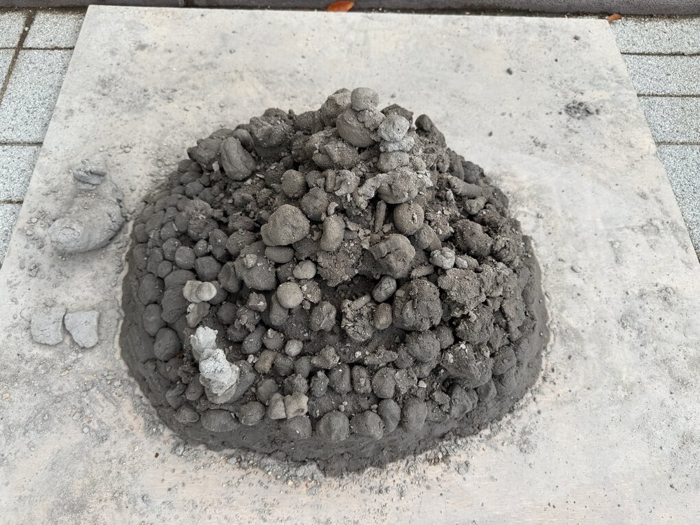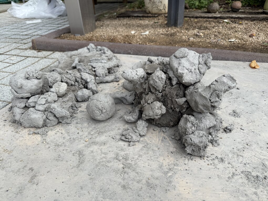 まずは事前に決めておいたゴジラGr、ケーキGr、アカハライモリとカマキリGrの3つに分かれて、 材料の粘土づくりからスタート。子ども達は触り心地の良いサラサラの土に水を含ませ捏ねていきます。すると段々と砂から玉になって、さらに水を加えていくと粘土になっていくその不思議と面白さを肌感覚で感じながら20分程コネコネ…ようやく土粘土の準備ができました。