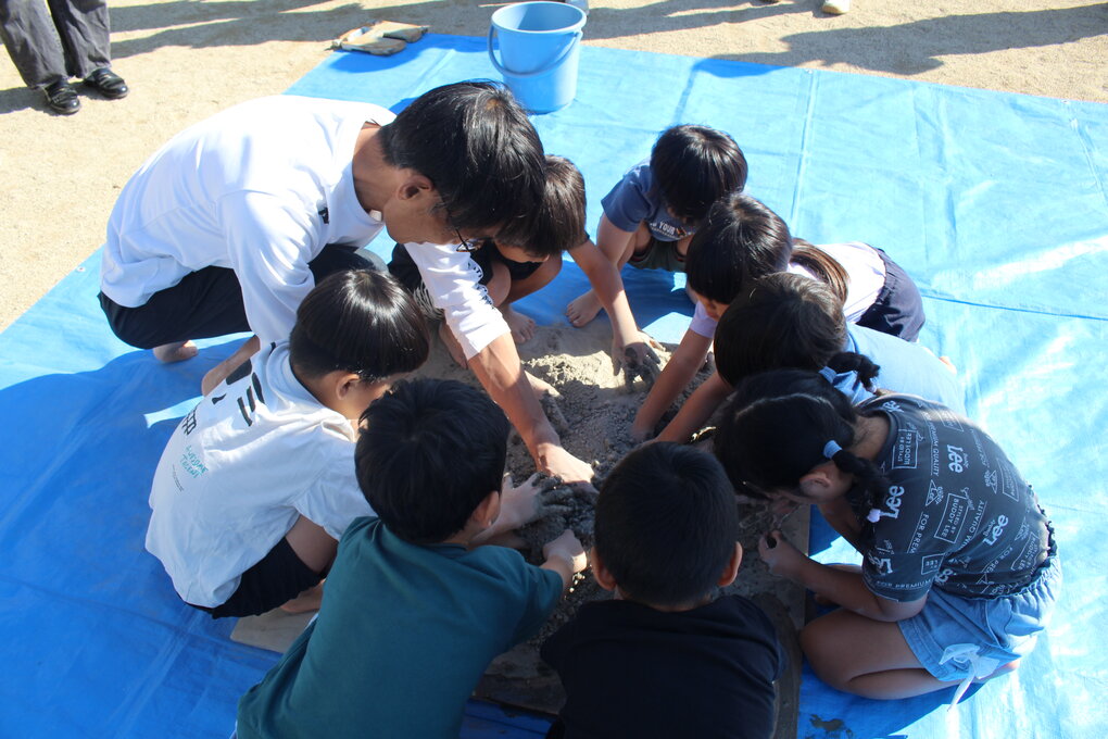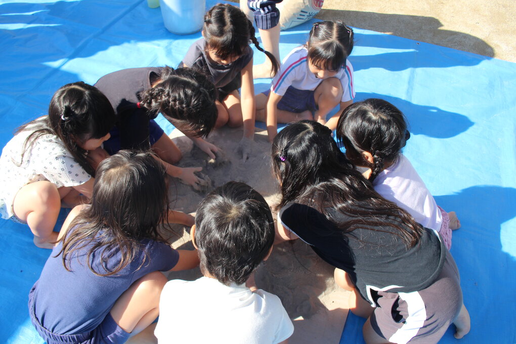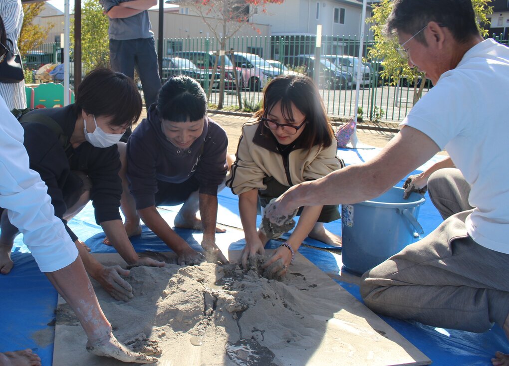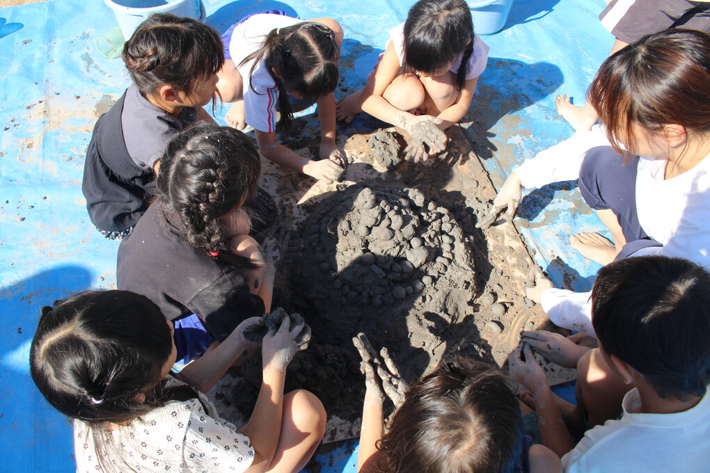 この日の活動の目的は、土から粘土になる不思議さを感じながら自分の手で捏ねて粘土を作る不思議さや面白さだったり、作りたい物をグループの中で共有して皆で1つの大きな作品を作り、満足感と達成感を味わう、としました。