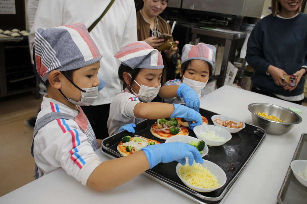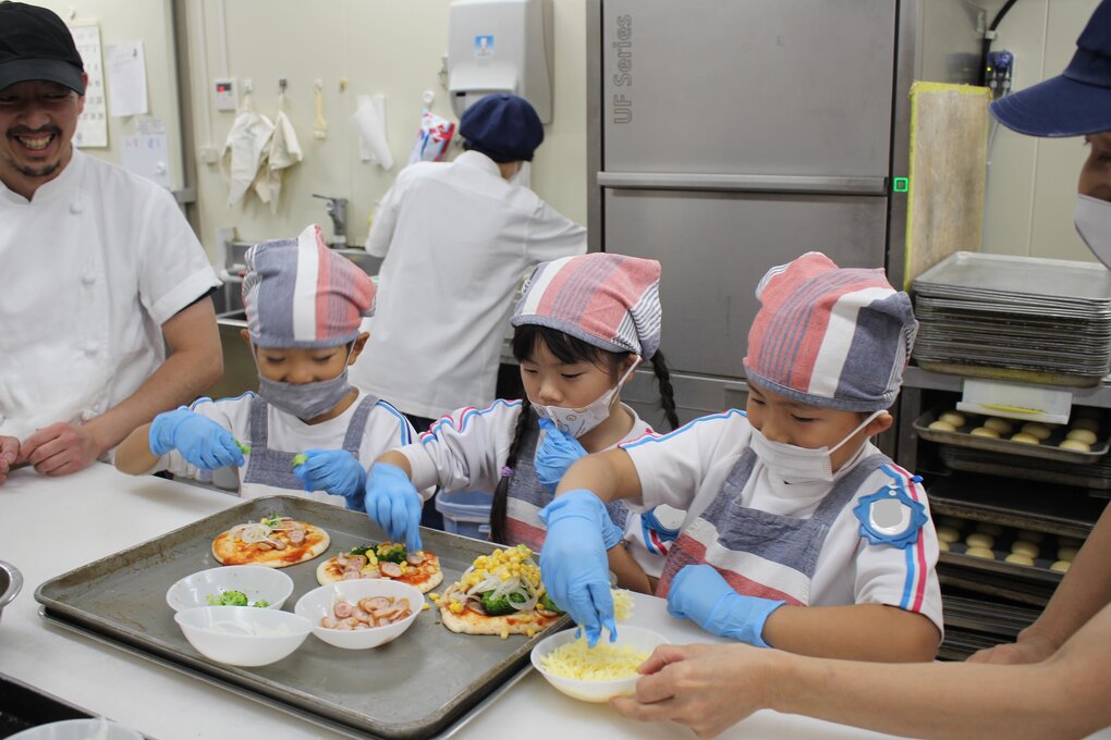 体験③ピザパンとクッキーメロンパンの仕上げ体験。ピザパンは、もちもちの生地にウインナーやコーン、玉ねぎ、チーズなどを自分の好きなように(お店の方に申し訳ない程ダイナミックに)盛り付けました。山盛りの具材やチーズに「焼けたらどんな風になるかなあ~」とワクワクの子ども達。クッキーメロンパンは、パンに乗せるパンダとコアラ模様のクッキー生地(冷凍)の冷たさに驚きながらも、パンの上に丁寧に生地をのせることができました。その後はスタッフさんがパンを窯に持っていって焼いてくれました。