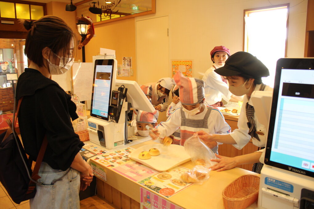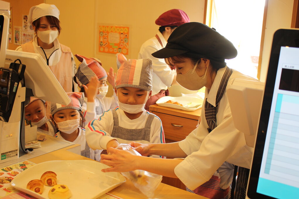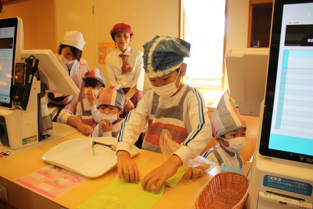 体験①パンの袋詰め体験。「いらっしゃいませ!」とお客さんに挨拶し、慎重にトングを使ってパンの袋詰めをしました。「パンがつぶれないように入れるのが難しかった!」「お店の人になったみたいで嬉しい!」との声が聞かれましたよ。また、この時実際のレジも見せてもらってお店の中に200種類以上のパンがあることも教えていただきましたよ。