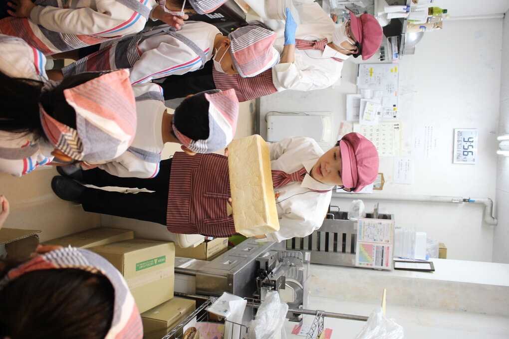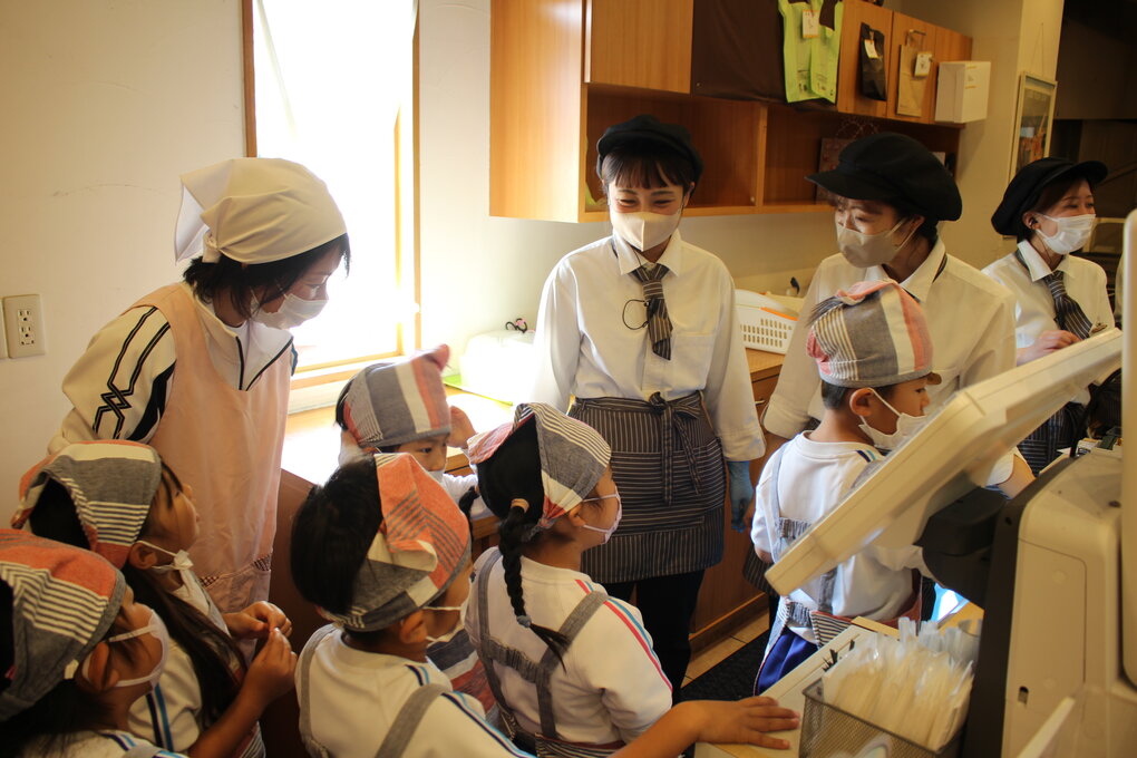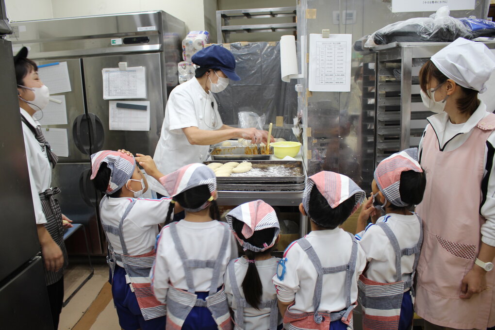 体験②工房と呼ばれる5つの部屋(調理場)の見学。サンドイッチを作る部屋では、パンをスライスする様子を間近で見たり、カレーパンやホットドッグを作る部屋では、大きな機械で子ども達も大好きなカレーパンの具材を作っている様子を見たり、他にも-18.5℃の冷凍庫や200℃を超えるオーブン、発酵させているパンが並んでいたりと、どれも子ども達にとっては珍しい場所ばかり!各部屋ではスタッフの方による説明を子ども達は真剣な表情で聞いたり質問したりしていました。