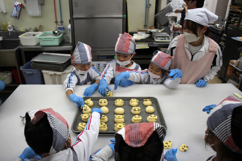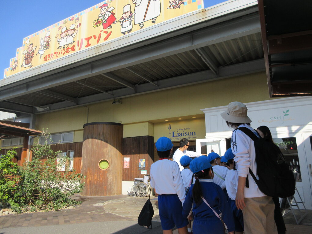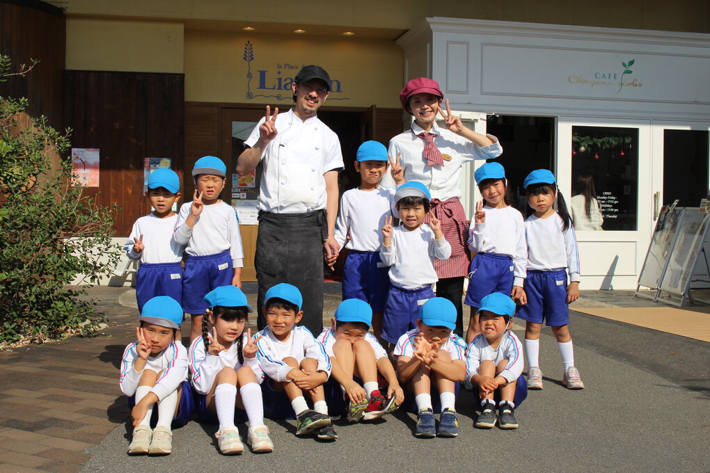11月7日・14日、この2日間、子ども達が地域の身近なパン屋さん『おかやま工房リエゾン』に行ってパン職人体験をさせていただく「パン職人になろう!プロジェクト」を行いました。 園から歩いてお店に到着後、スタッフの方に連れられて裏口のスタッフ専用の出入り口から入らせてもらい、更衣室で着替えと注意事項の説明を聞いた後、いよいよ店内に入ってプロジェクトがスタート。