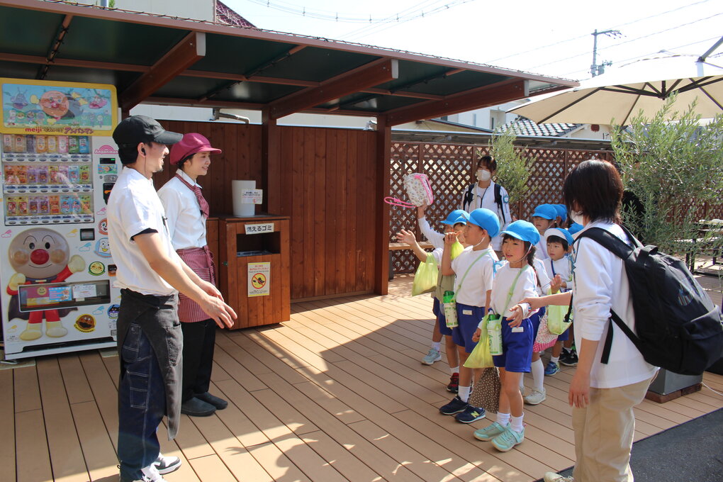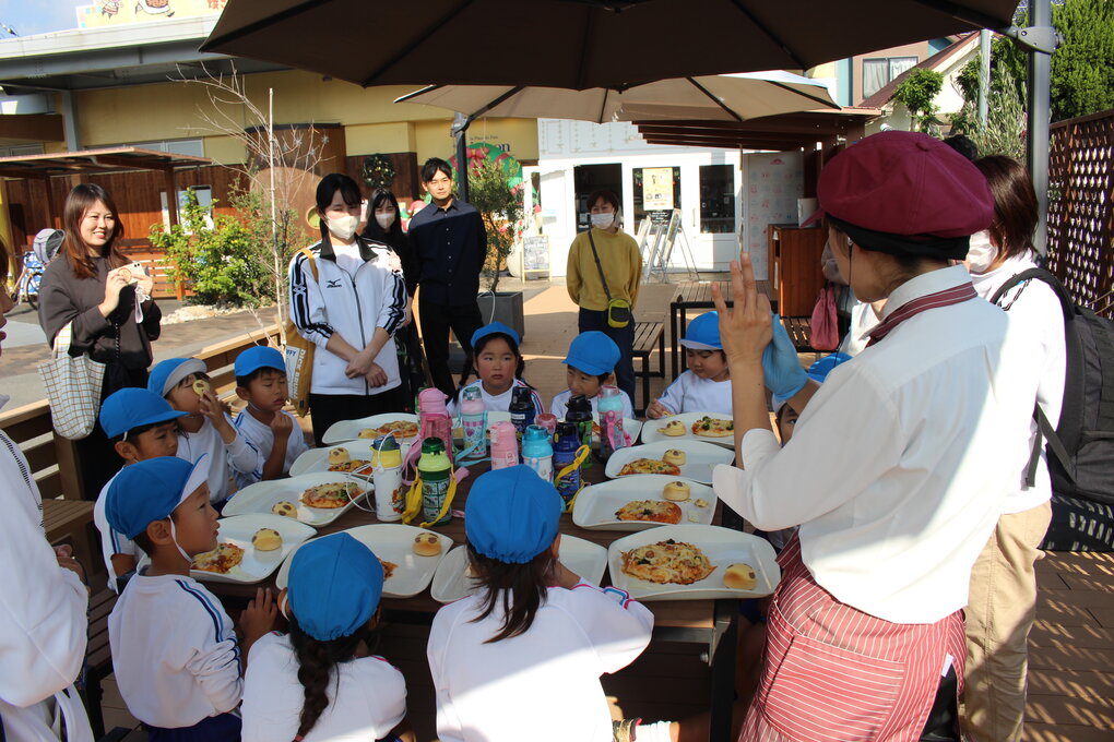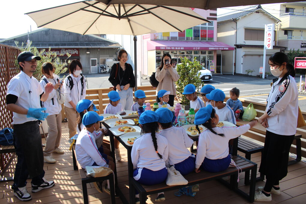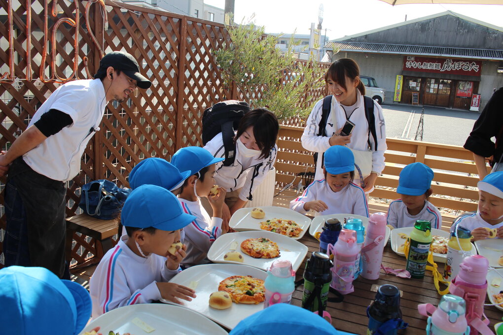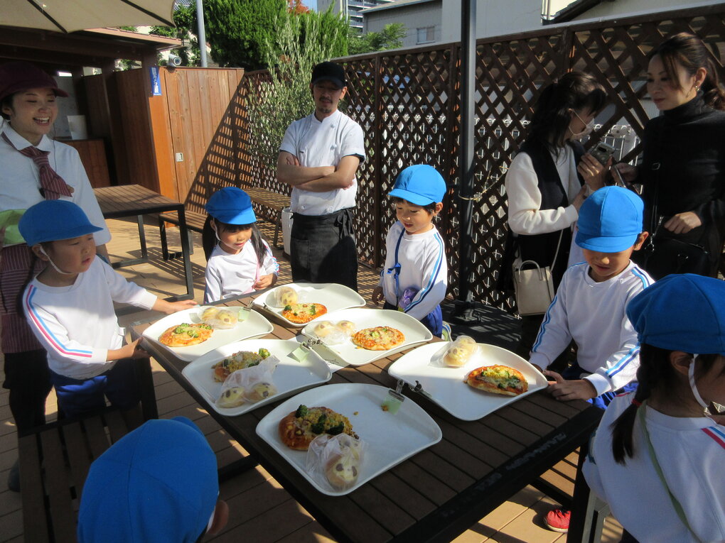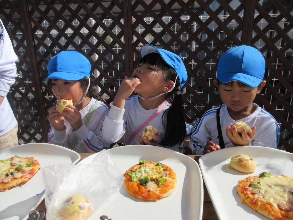 活動後は、敷地内のテラス席をお借りして気持ちの良い青空の下、自分達でトッピングしたパンが焼きあがって運ばれてきて大感激・大感動の子ども達。本当は全部食べたいところですが、給食もあるのでクッキーメロンパンを1つだけテラス席でいただきました。「いい匂い!」「あったかいよ。」「もっちりしてて美味しい~!」と、どの子も嬉しそうに頬張っていました。(ピザパンともう1つのメロンパンは持ち帰りました)