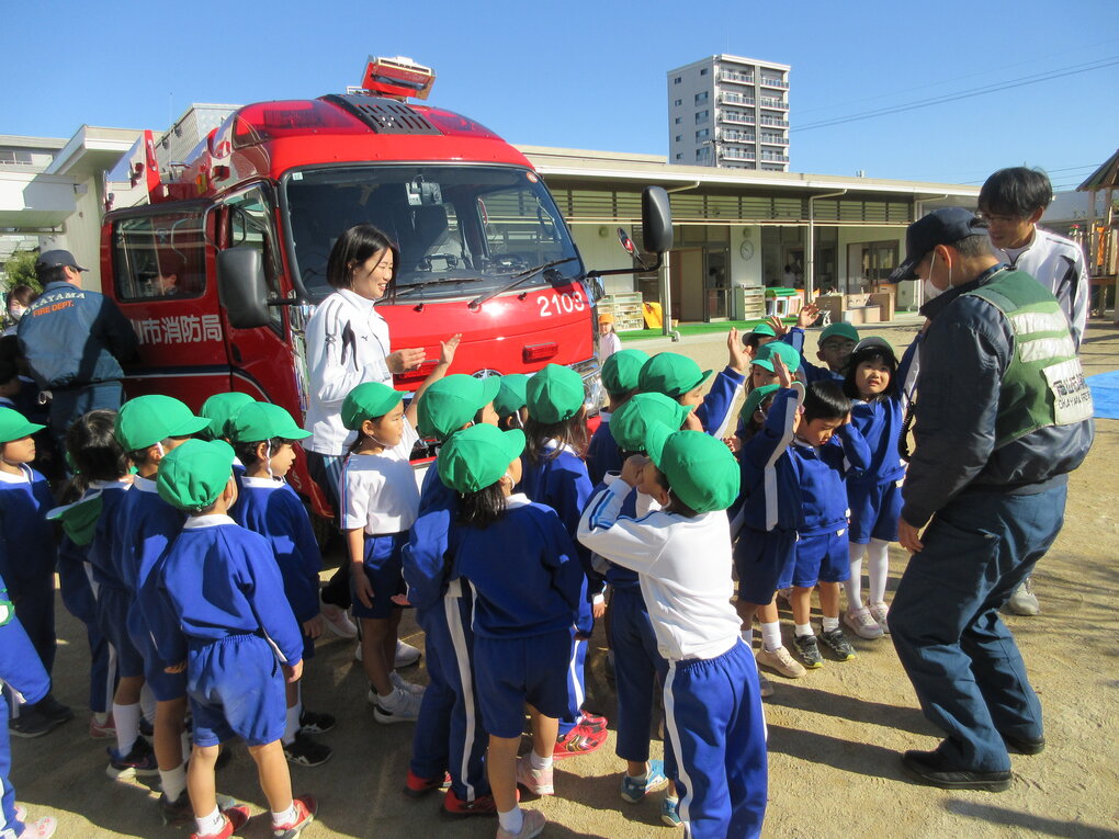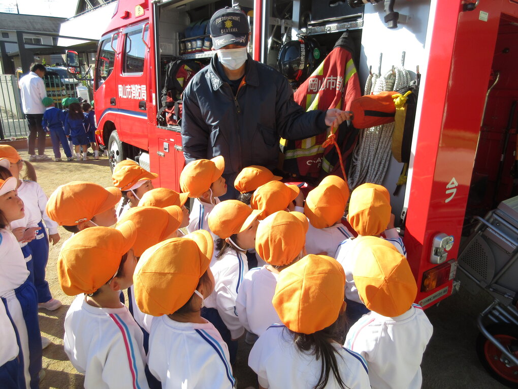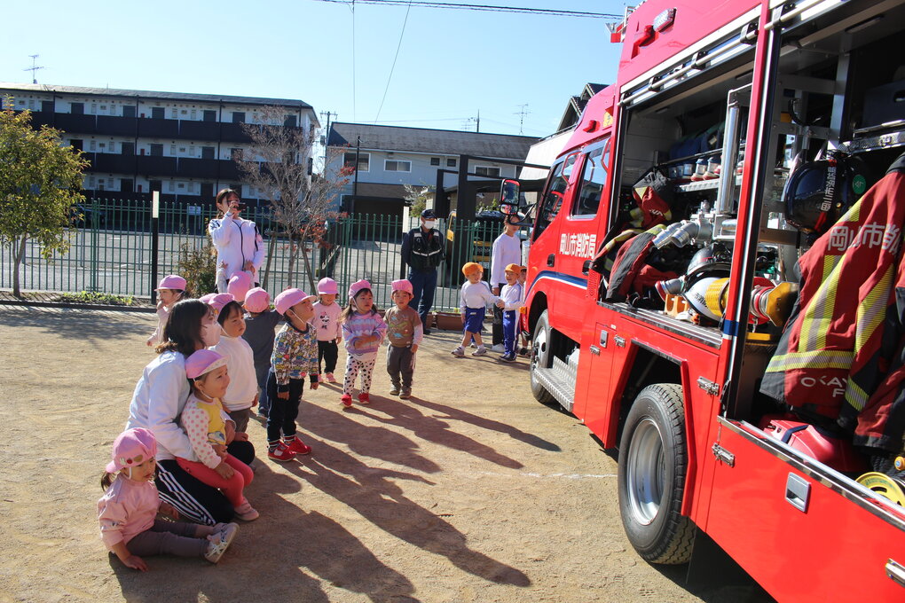 11月19日(水)、岡山市消防局 北消防署 今出張所にご協力いただき、園にて消防車見学と避難通報訓練を行いました。朝、園庭に停まった消防車(ポンプ車)に大喜びの子ども達。