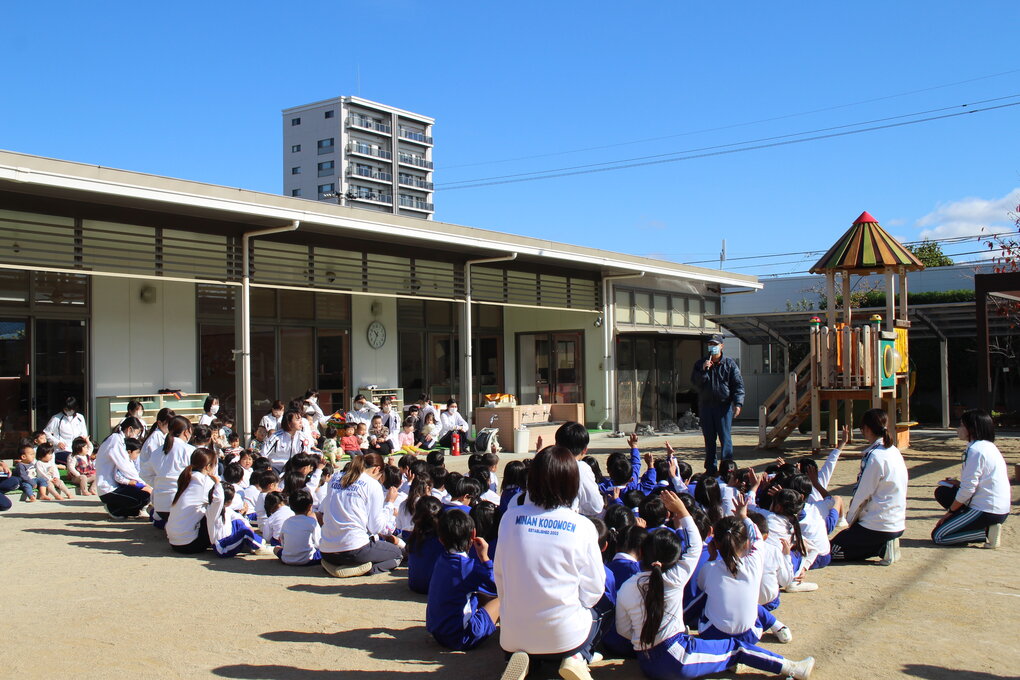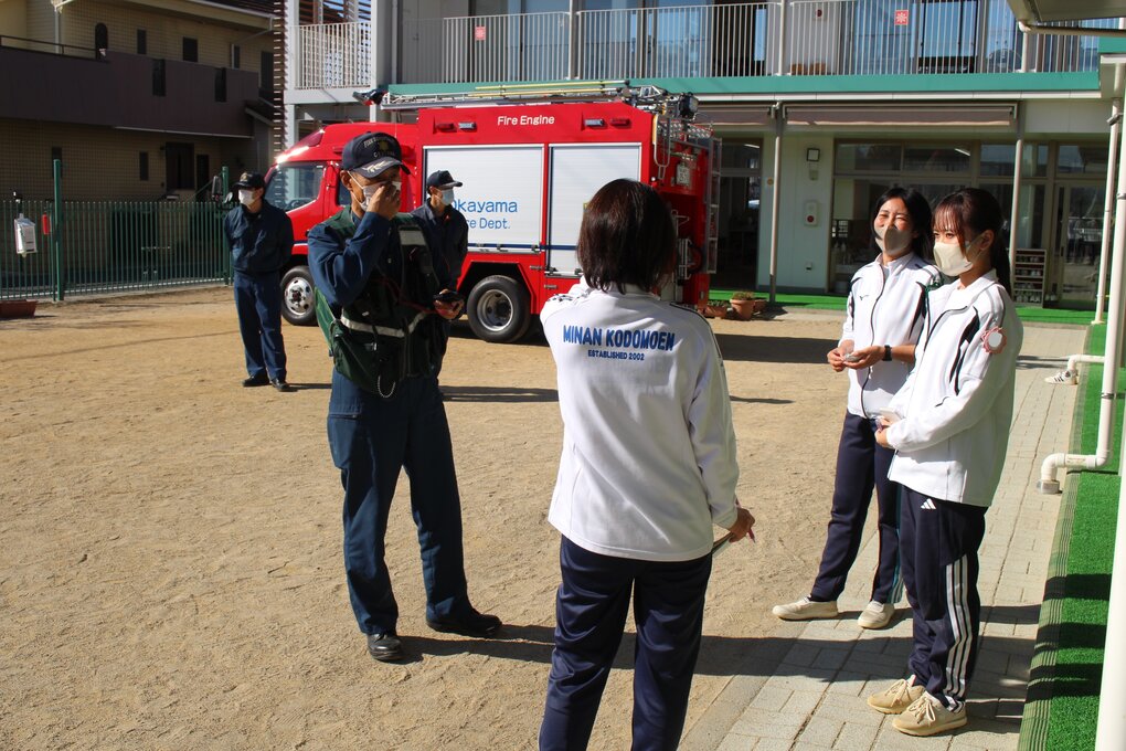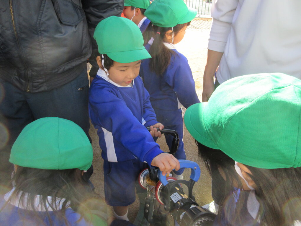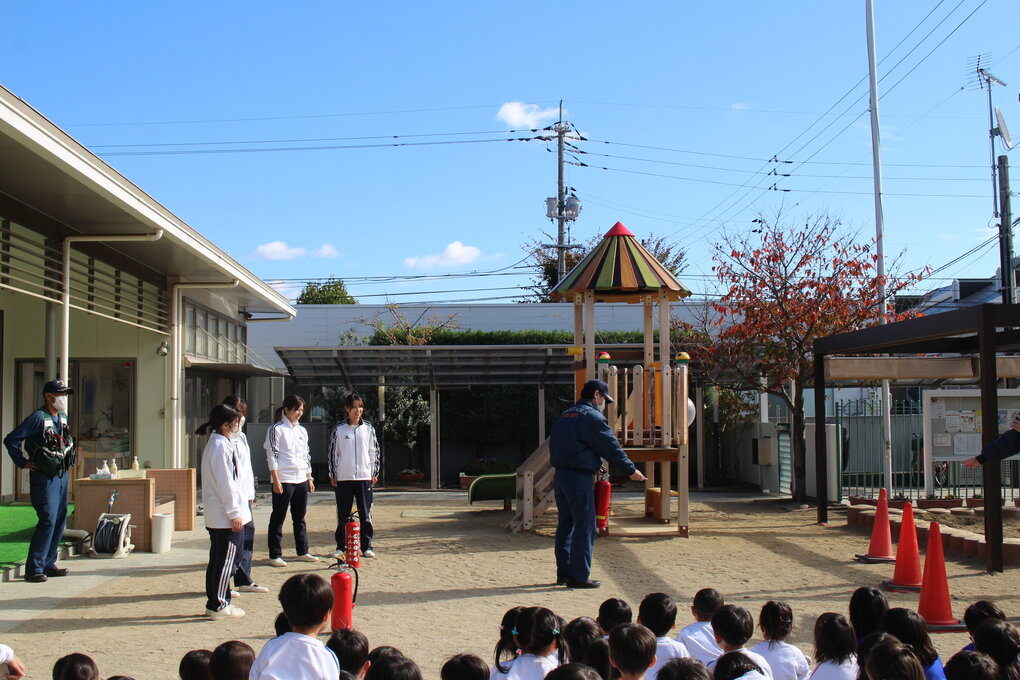 訓練後の講評では「先生のお話をよく聞いていたからとっても上手にできていたよ」と褒めてもらい、また、火事のお約束「お(おさない)は(はしらない)し(しゃべらない)も(もどらない)」を教えてもらって次の避難訓練からも気をつけて行うことを確認しました。その後、保育者を対象とした水消火器を使った初期消火訓練を行い、もしも火事(災害)が起こった時…まずは自分の命を守れるように、今後も定期的な避難訓練を緊張感をもって取り組んでいこうと思います。今出張所の消防士の皆様、お忙しい中、本当にありがとうございました。引き続きお願いいたします。