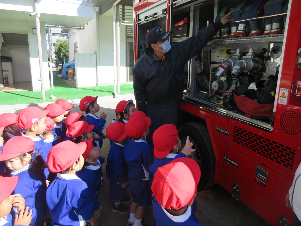 はじめに、全クラス消防車見学を楽しみました。0歳児クラスは保育者に抱っこしてもらって消防車に近づき、その大きさを感じることができました。1歳児クラス以上は消防士さんにポンプ車の設備について丁寧に教えてもらいながら、興味や関心を高めながら消防車見学をすることができました。見学中、消防士の方に「消防車ってどうして赤色なの?」、「ガソリンスタンドにはいくの?」、「消防士さんっていつもどんなお仕事してるの?」など、子ども達からのよう容赦のない質問に分かり易く答えていただいたり、年長児クラスは実際に使用している防火着を着させてもらったりして、消防士という職業について思いを巡らせたり、命を守る仕事の厳しさや尊さを直接消防士さんから聞いて学べる有意義な時間になりました。