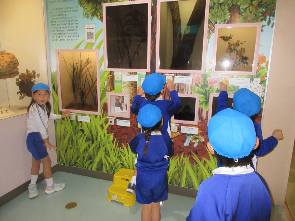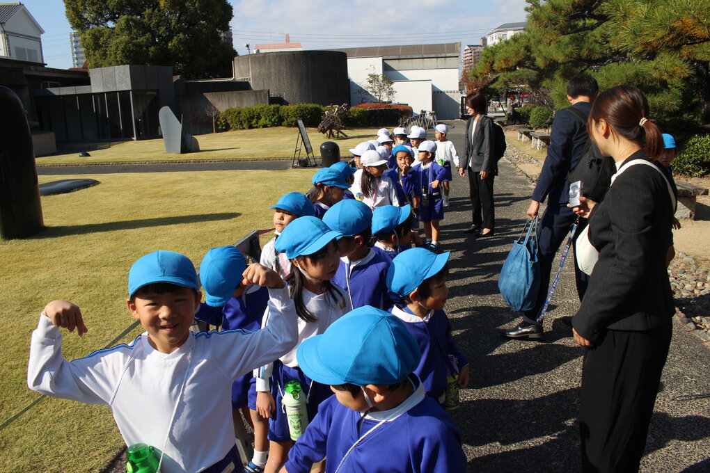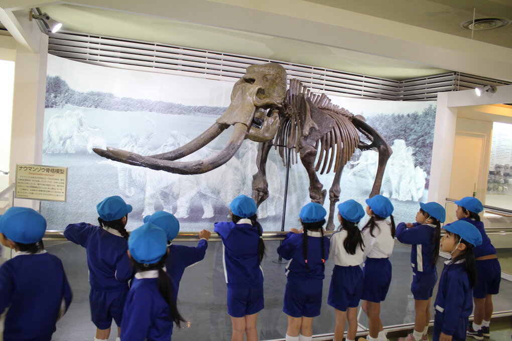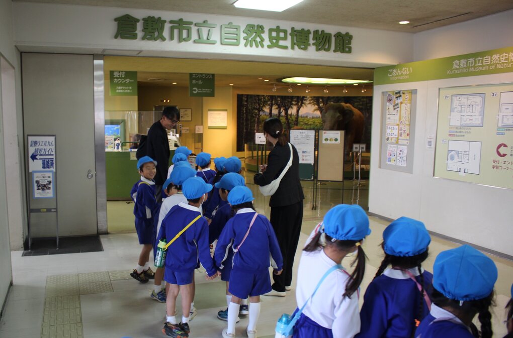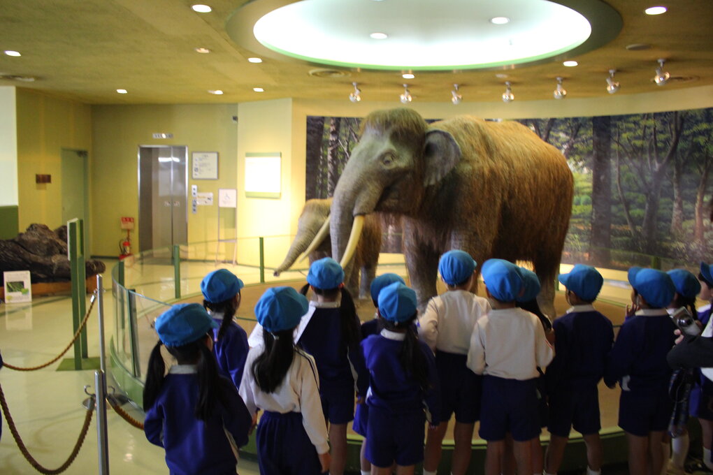 11月21日(金)、カエデやイチョウなどの紅葉が美しい倉敷の街並みを見ながら年長児クラスは大原美術館と倉敷市立自然史博物館へ遠足に行きました。 どんな作品や生き物に出会えるかな?とワクワクの子どもたち。行きのバスの中では、「アンモナイトを見てみたい!」「いろんな色の絵を見つけたいな」と、楽しみにしていることを口々に教えてくれました。美観地区に到着後、早速自然史博物館へ。最初に大きなナウマンゾウ(30万年前のゾウ)の親子が子ども達をお出迎えしてくれました。