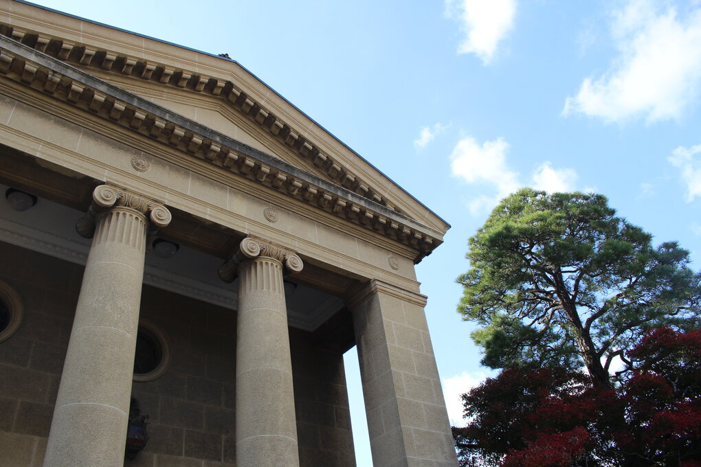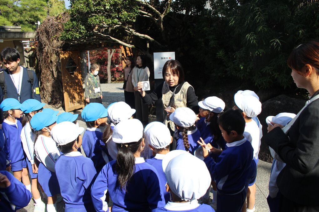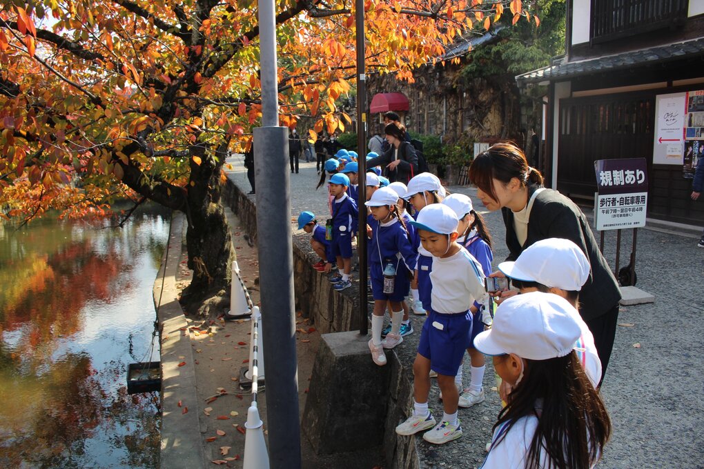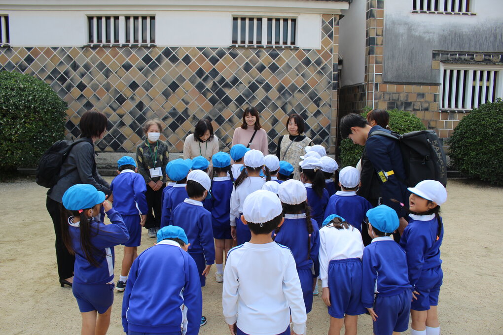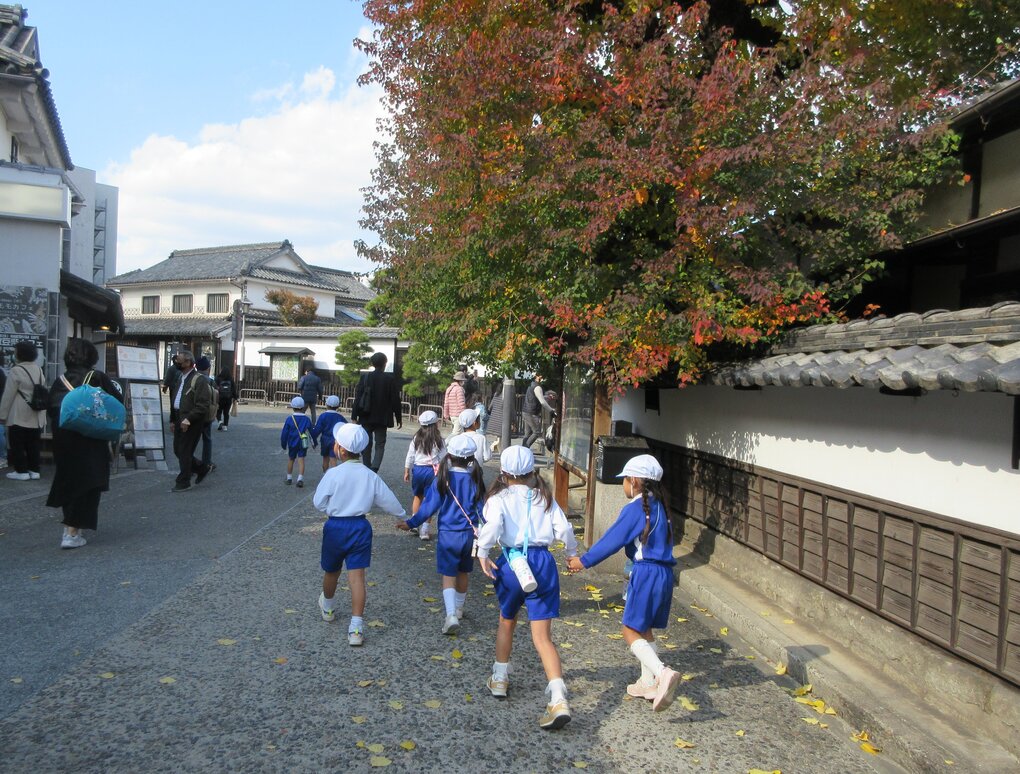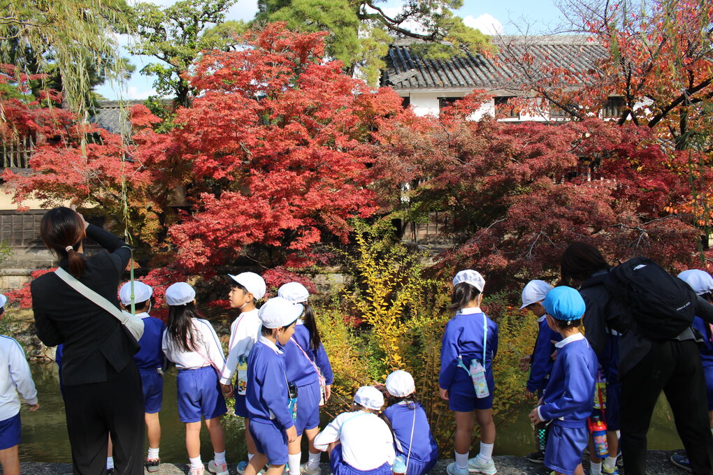 11月21日(金)、カエデやイチョウなどの紅葉が美しい倉敷の街並みを見ながら年長児クラスは大原美術館と倉敷市立自然史博物館へ遠足に行きました。 どんな作品や生き物に出会えるかな?とワクワクの子どもたち。行きのバスの中では、「アンモナイトを見てみたい!」「いろんな色の絵を見つけたいな」と、楽しみにしていることを口々に教えてくれました。美観地区に到着後、早速自然史博物館へ。最初に大きなナウマンゾウ(30万年前のゾウ)の親子が子ども達をお出迎えしてくれました。