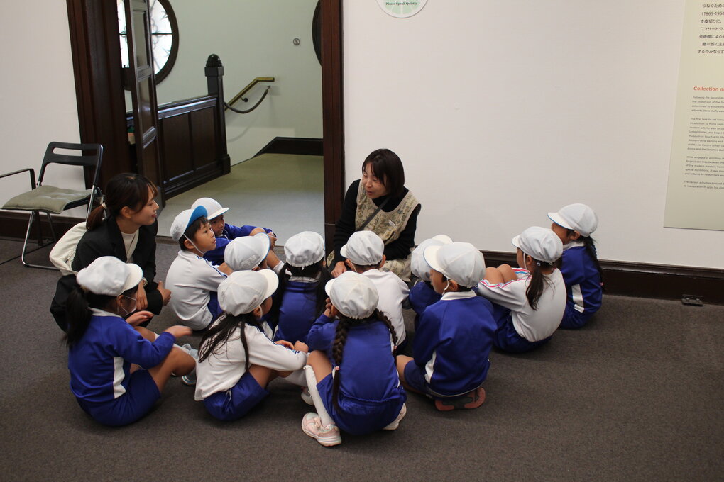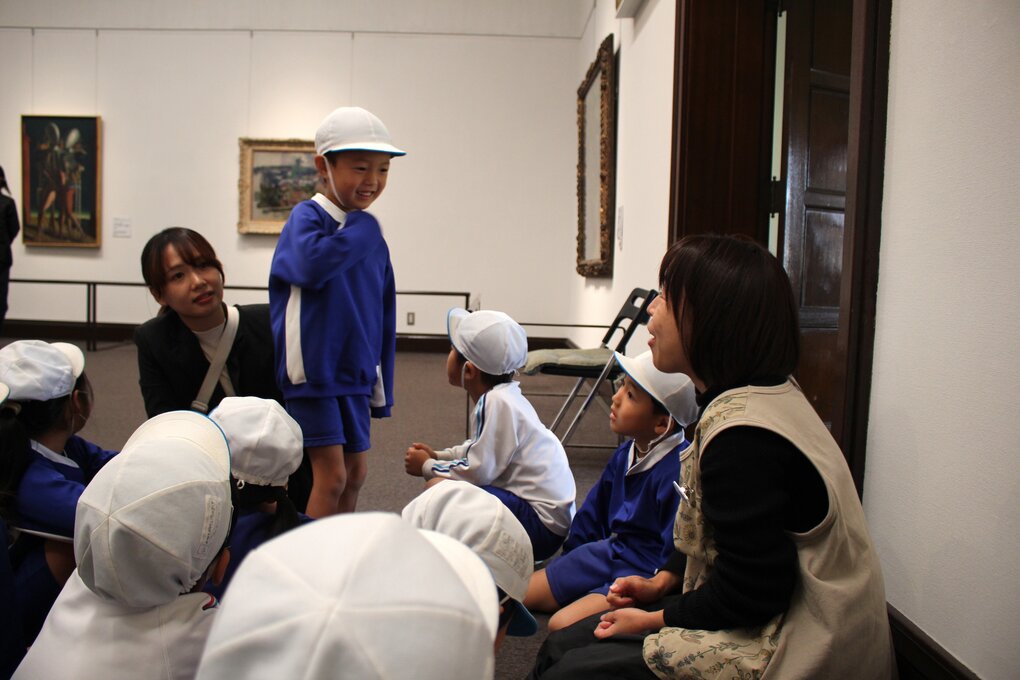 本館では、展示室の中に展示してある色々な時代や大きさや技法の異なる絵の中からお気に入りの1枚を探して皆の前で発表しました。この絵探しでは、「本物みたい」「クマの爪痕みたいな絵があった」「黒色の中に数字を見つけたよ」「虹がかかっているよ」など、それぞれに色彩の鮮やかさや作品の美しさ、表現方法の面白さを感じることができました。