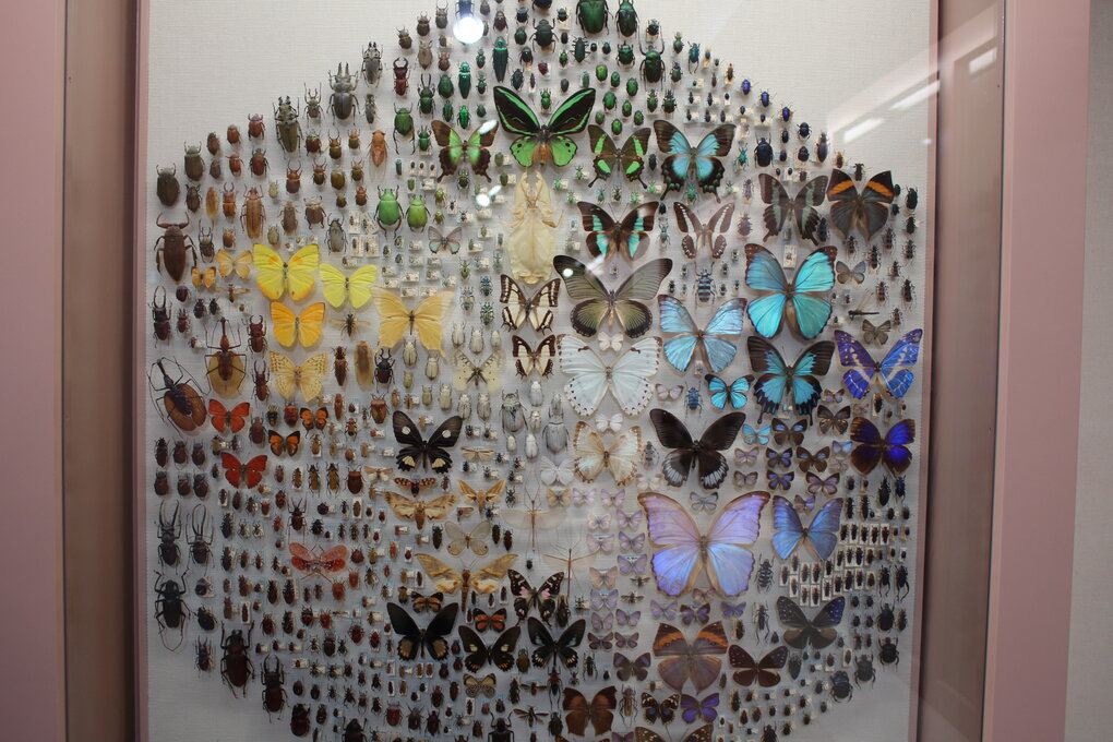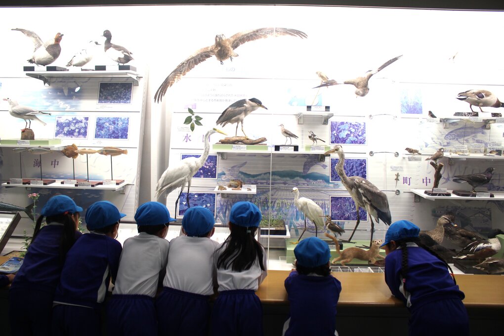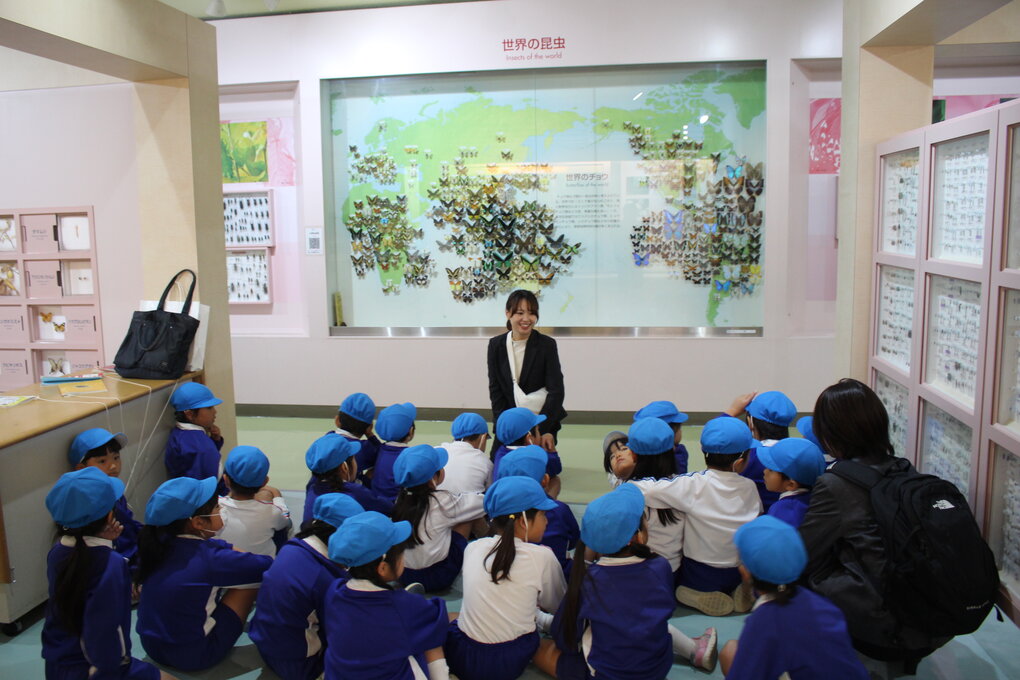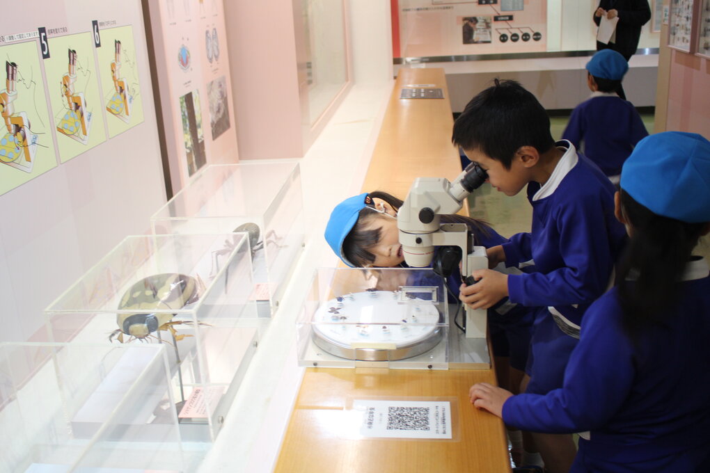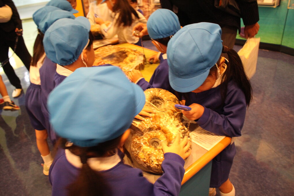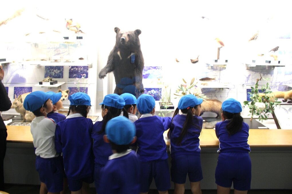 続いて、2階の展示室では、ティラノサウルスの頭の骨格模型や太古の化石を見たり、触れたり…。その後も岡山に住む生き物のはく製や、世界の昆虫標本(特にチョウは圧巻!)を夢中になって見て周り、「イノシシは大きかった」「ツキノワグマは思ったより小さかった」「(見る向きによって)色が変わるチョウがいた」「コノハムシっていうおもしろいムシがいた!」など、これまでの自然体験の経験から生き物への興味や関心、科学的な好奇心が高まっている子ども達は、約1時間、それぞれに発見や感動を思う存分楽しんだようです。