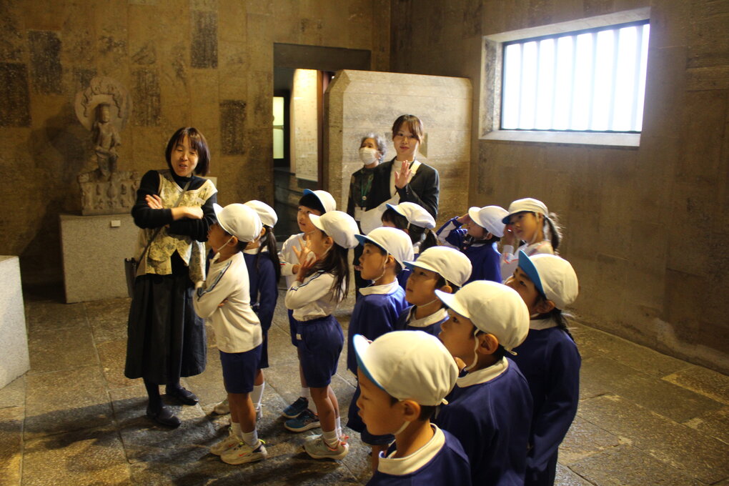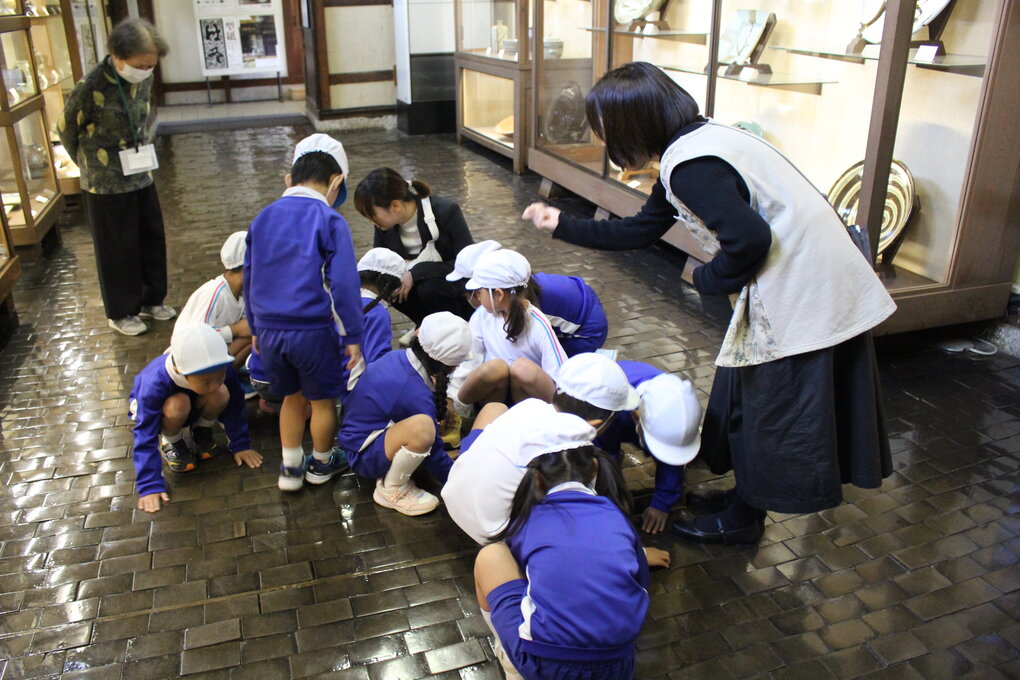 次に、工芸・東洋館では、陶芸作品や、版画の作品などを見ました。歩いて行くと、「なんだか床がツルツルする!」と気付いた子ども達。学芸員の先生から床のレンガが栗の木でできていることを教わると、「あっ!指紋みたい(年輪の模様)になってる!」ことを発見。他にも焼き物や版画、石像などの作品鑑賞から質感の違いや表現の豊かさ等を楽しむことができました。