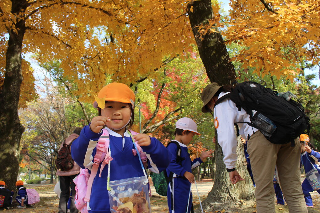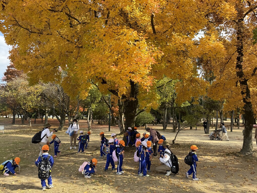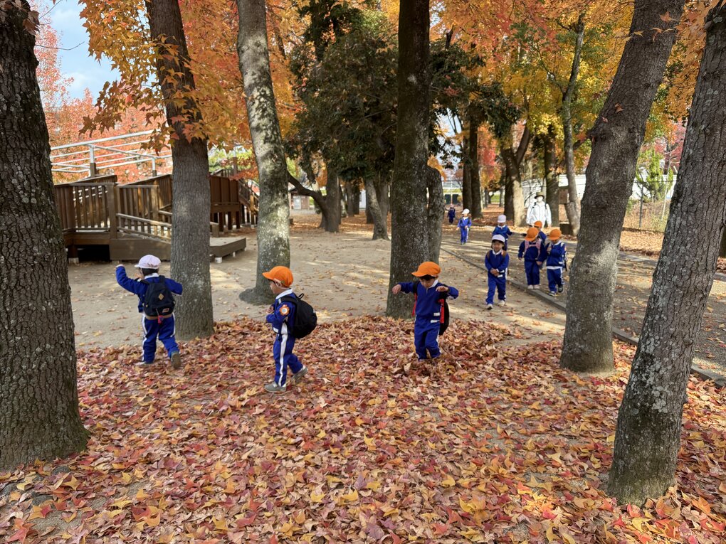 バス到着後は落ち葉の絨毯の上をザックザックと音と感触を楽しみながら歩きます。途中、あまりにも落ち葉が綺麗だったので計画にはなかった落ち葉かけを皆で楽しみました。