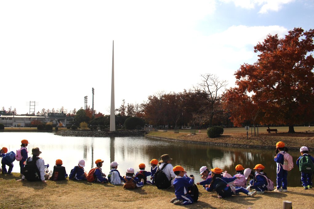 すっかりお腹いっぱいになって、元気が戻った子ども達。広い公園内を赤や黄色に色付いた落ち葉や木の実(ドングリ)を特製の手作りバックに入れながら散策しました。その後、池の前の芝生に腰を下ろし、温かい太陽光が反射してキラキラと光る水面を眺めたり、寝転がって青い空を眺めたりしました。子ども達からも「気持ちいい!」「楽しかった~」という心の声がたくさん聞かれました。