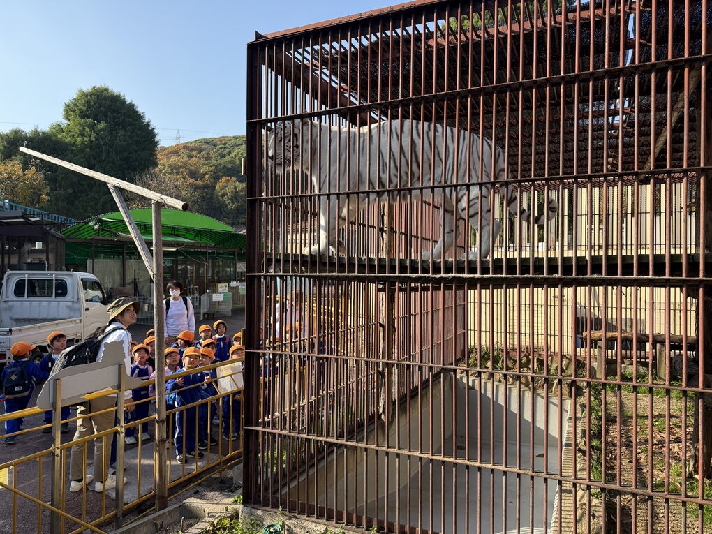 池田動物園に着いて、さっそく園内へ入るとホワイトタイガーが元気にのっしのっしと歩いて子ども達をお出迎え。その後リスザルやワオキツネザル、ツキノワグマやレッサーパンダに会えることを楽しみに、微妙に坂道になっている園内をてくてく力強い足取りで歩きました。