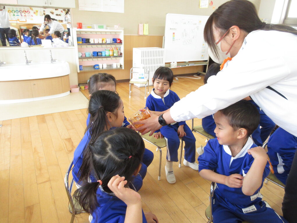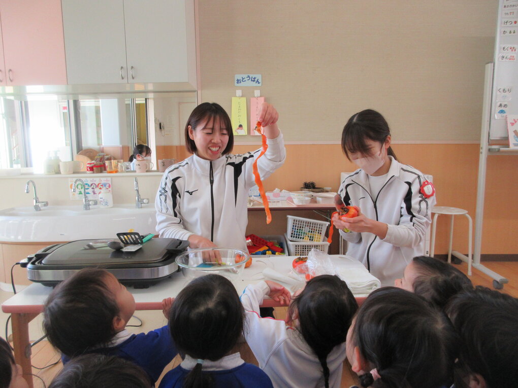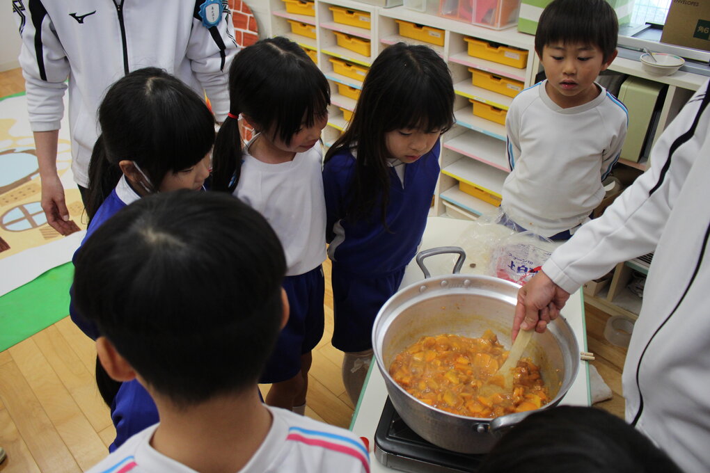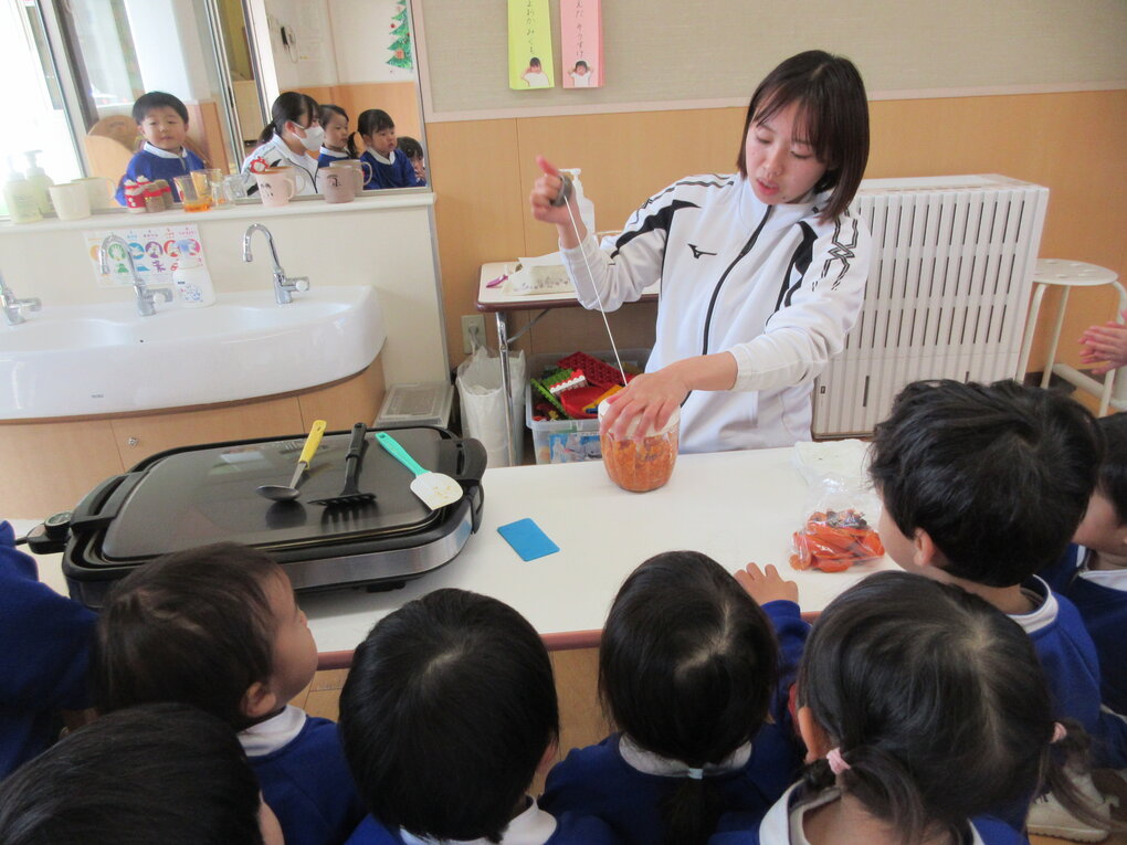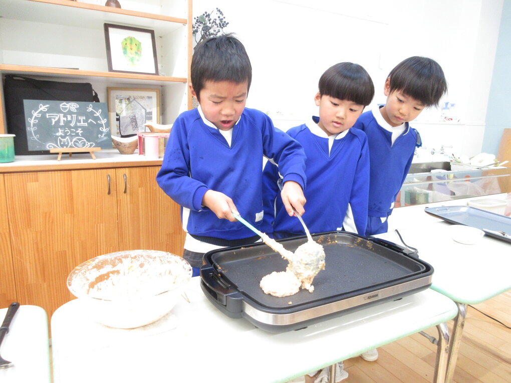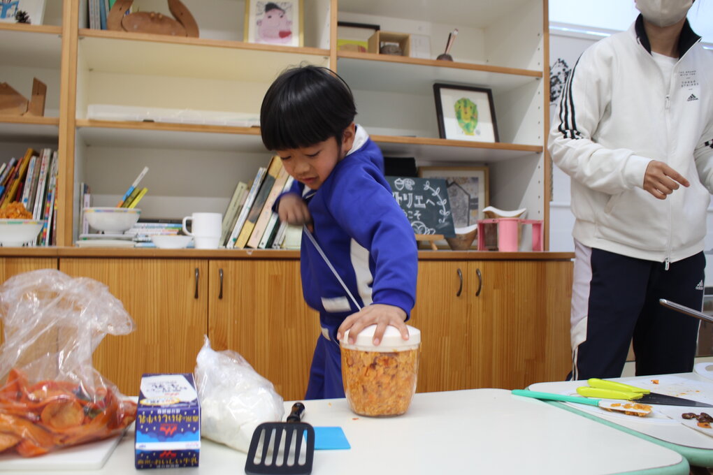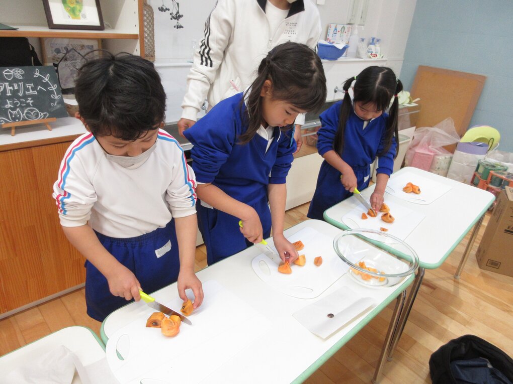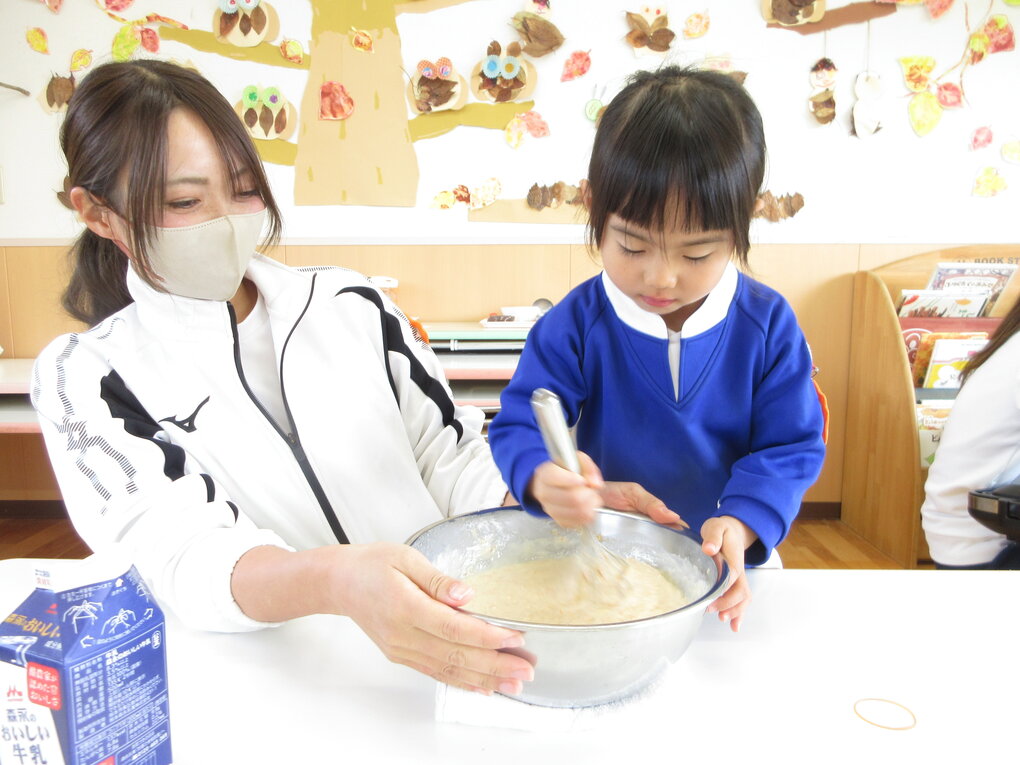 自分たちでぶんぶんチョッパーを使って柿を撹拌すると「にんじんみたいになった」「ちょっとどろどろ」、匂いを嗅ぐと「あまいね~!」「柿ってかんじ」「おいしそうなにおい」と思い思いの感想が聞かれました。 次は、ホットケーキミックスと柿に牛乳を加えて、左手でしっかりボウルを抑えながら生地を混ぜて、生地をホットプレートに流し込み、中まで焼けたら完成!「おいしすぎ~」「柿の味がするわ~」「ちょっとジャムみたい」と、とても喜んでいた子ども達。思いの外たくさんできたので、相談した結果、他のクラスにお裾分けをすることに…。おいしく楽しく、そして優しさたっぷりに秋の旬『柿』を味わった子ども達でした。