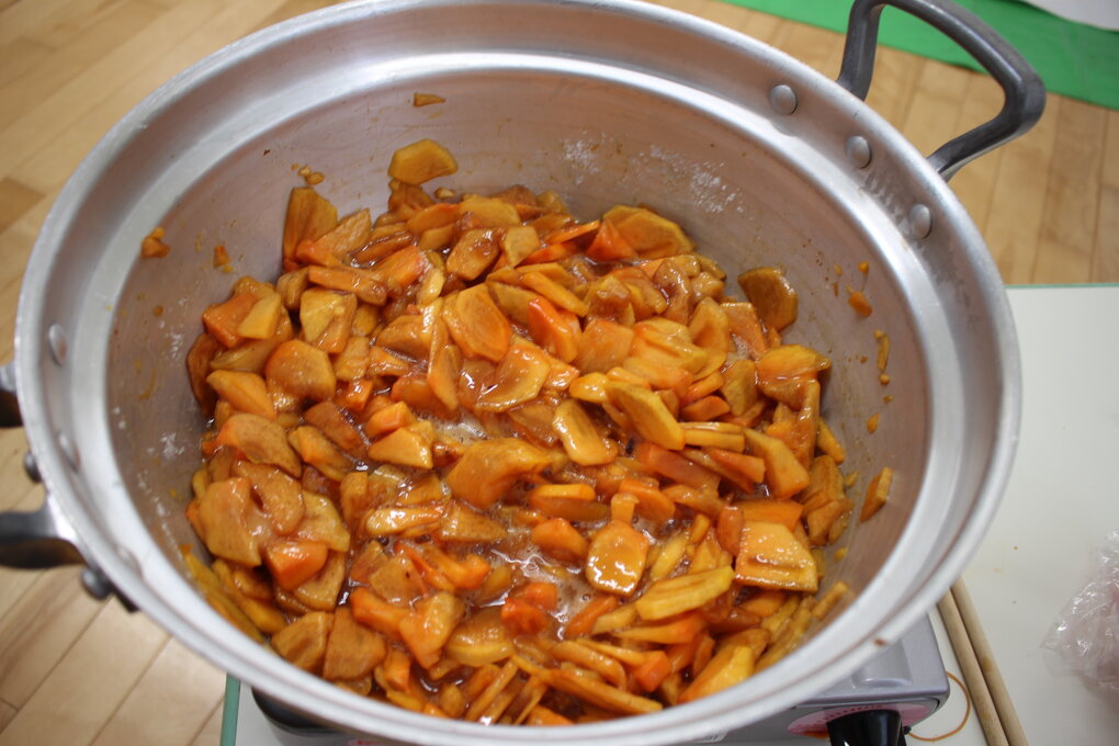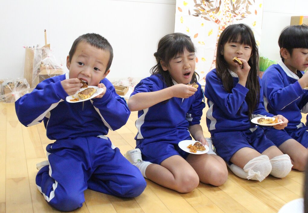 今回は、クッキングの全工程を子どもたちだけで挑戦!『切る、混ぜる、焼く』の3グループに分かれて作りました。まずは、包丁を使って柿を小さく切る作業から…。前回よりも包丁の使い方に慣れてきた子が多く、種をよけながら小さく切ることができていました。その後は、チョッパーを使って柿をさらに細かくした後ホットケーキミックスと混ぜてホットプレートへ!「ジューって音がしているよ」「いい匂いがしてきた!」とワクワクの子ども達。「そろそろ焼けたかな?」と、生地をひっくり返してみるとこんがりいい焼き色に…(少し焼き過ぎのものもご愛嬌)、思わず「おお~!」と歓声が上がりました。そして、柿がたっぷり入った全員分のパンケーキが完成!同時並行で隣でせっせと職員が作った柿のジャムを添えて、いただきます!「柿が甘~い!」「こんなパンケーキたべたことない!」「ほっぺたおちそう!」と、どの子も夢中で旬の食材を味わいました。