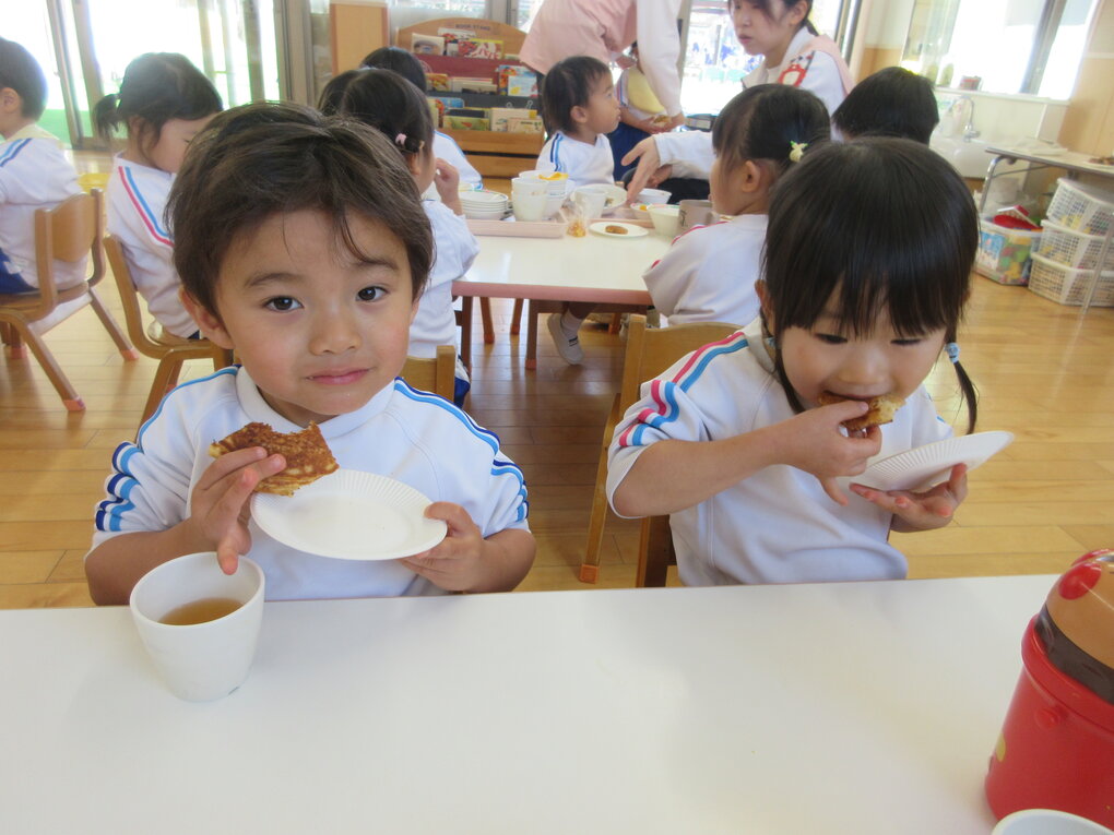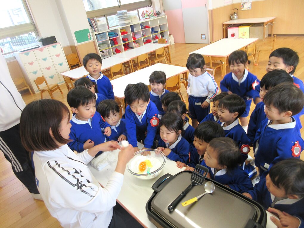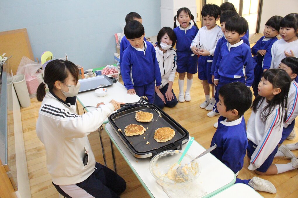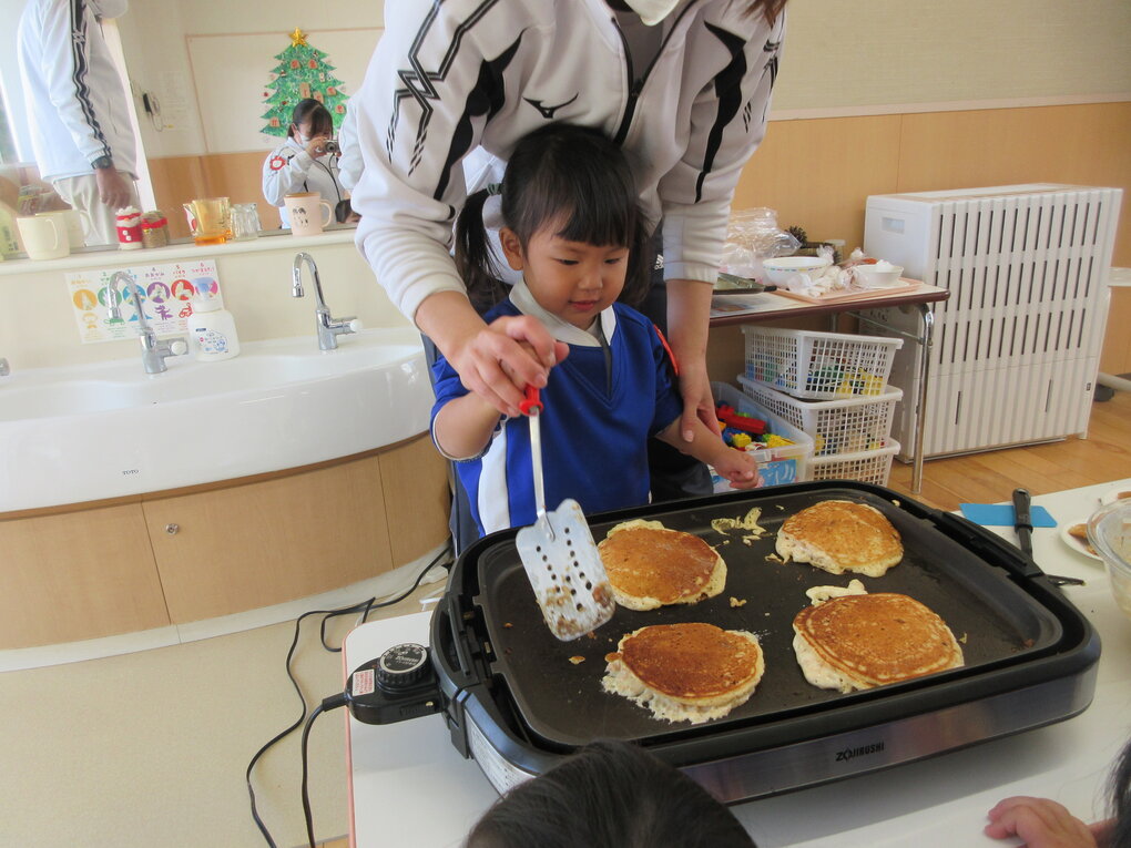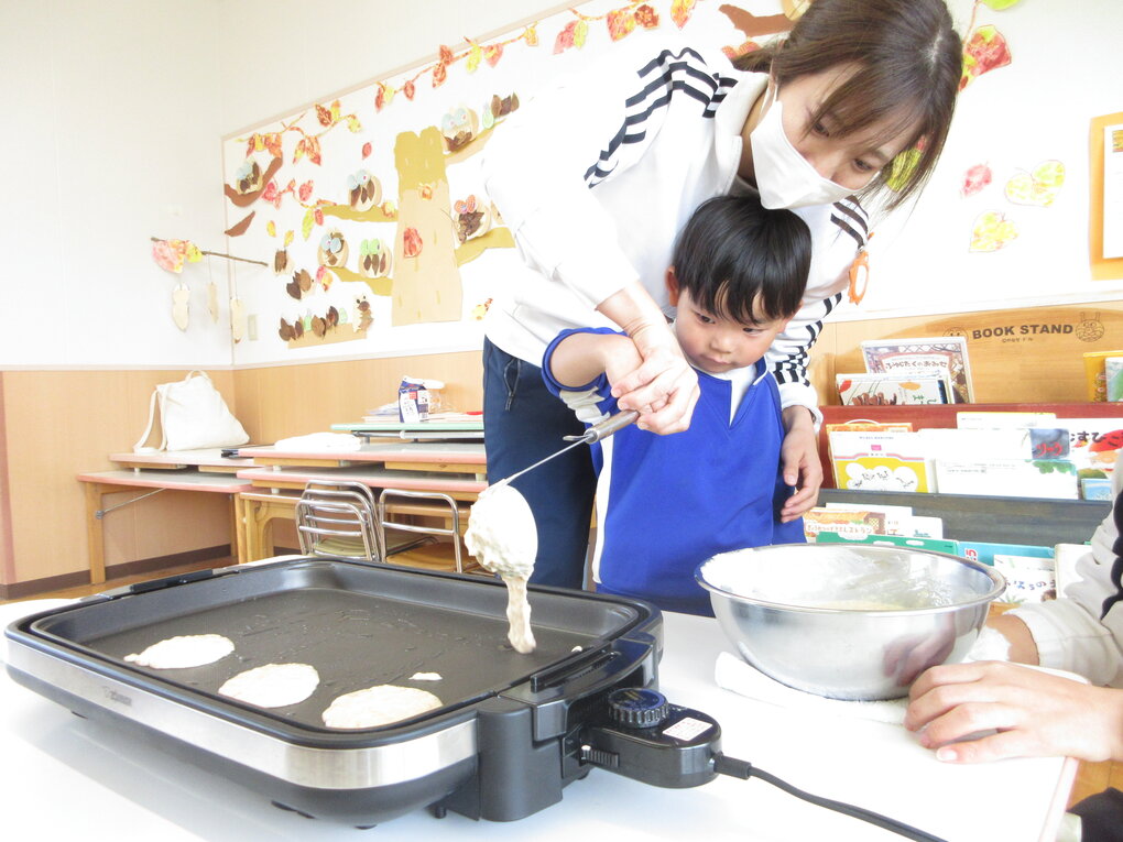 保育者が柿を切ったり、材料を混ぜたりするのを目を輝かせて見ていた子ども達。「たまごだ!」と一緒にコンコン、パカッと割る真似をしたり、「まぜまぜ~」と一緒に混ぜる真似をしたり、保育者と一緒に「せーの!それっ!」とひっくり返したりして焼き上がるのを待ち、完成したパンケーキは給食後のデザートとして食べました。「柿の味がする!」「ふわふわ!」「おいしいね!」などの感想が聞かれて、その後は殆どの子がおかわりをしていました。
