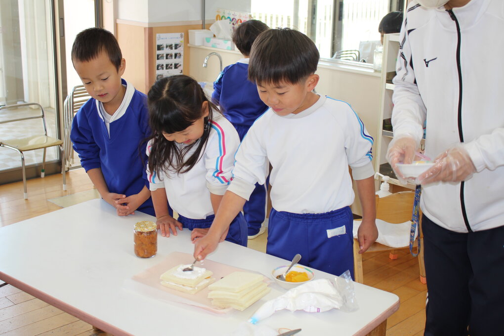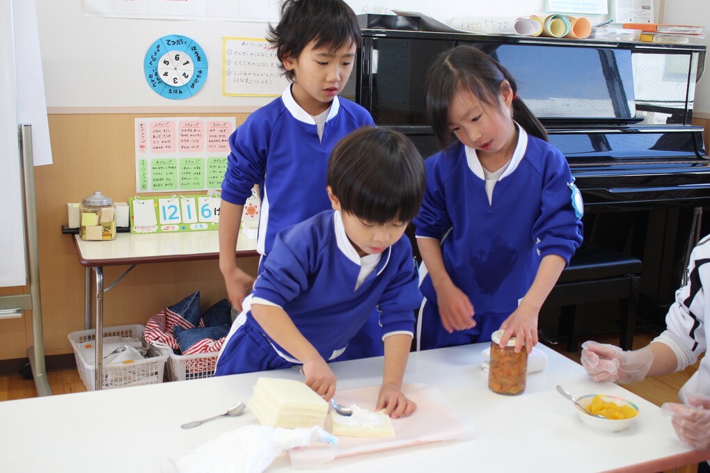 まずは土台Grが食パン(耳なし1斤10枚切りを使用)に生クリームをスプーンを使って丁寧に塗り、パンとパンの間に黄桃(缶詰)や先日作った柿のジャムを挟みました。このGrは完成後には見えない部分をいかに丁寧に仕上げるかが重要になるので、縁の下の力持ち的な資質が問われる気がします。