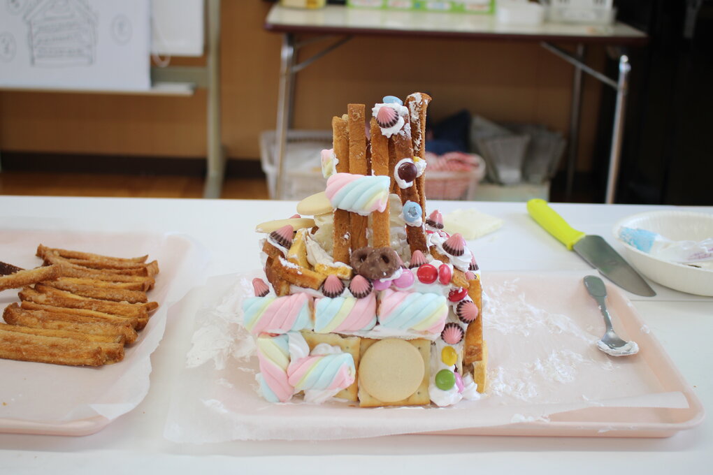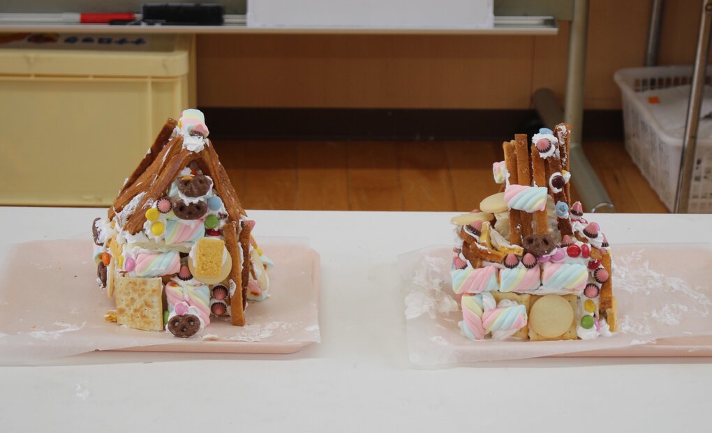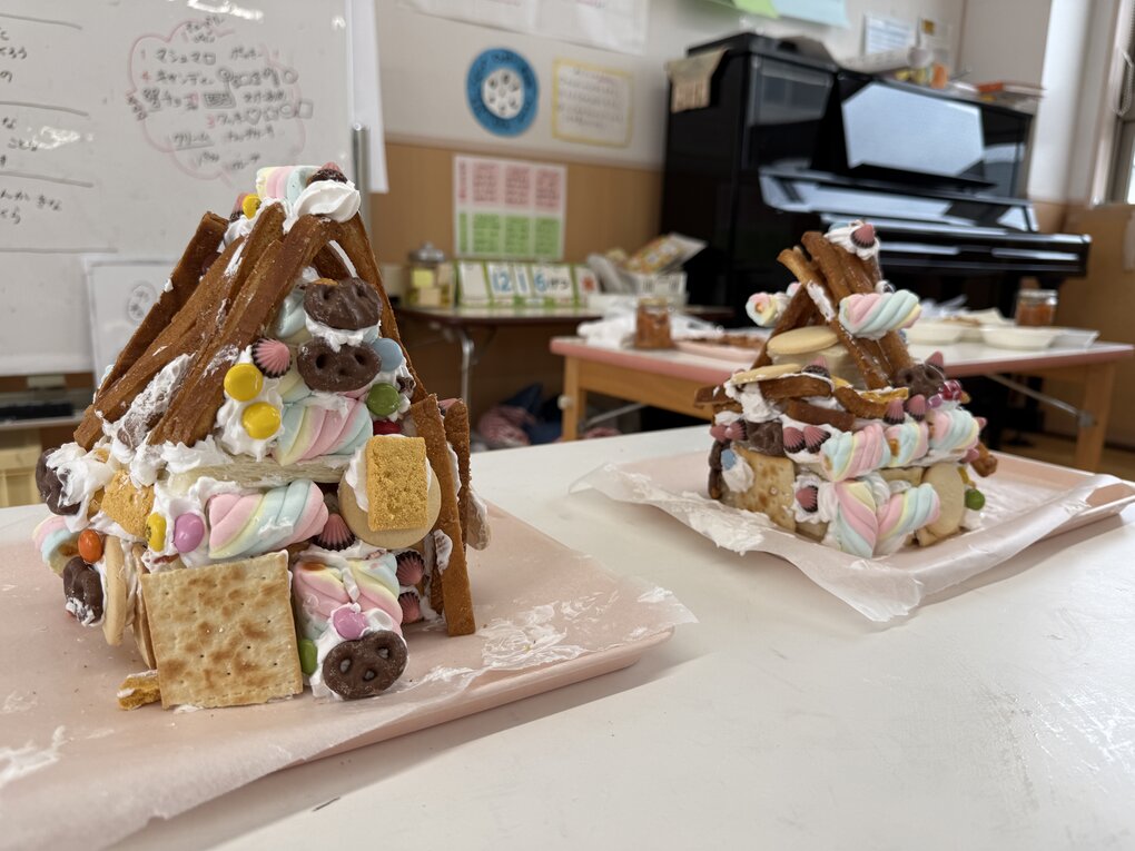 そうしてようやく完成した2棟のお菓子の家。並べてみると材料と工程は全く同じなのに2つの作品は全く違うモノに…。完成したお菓子の家を皆で見ながら、子ども達に感想を聞いていくと、「難しかったけど楽しかった」「魔女が出てきそう」など、ブログに書ききれない程の沢山の感想が聞かれ、この活動に対する子ども達の満足感や充実感が伝わってきました。
