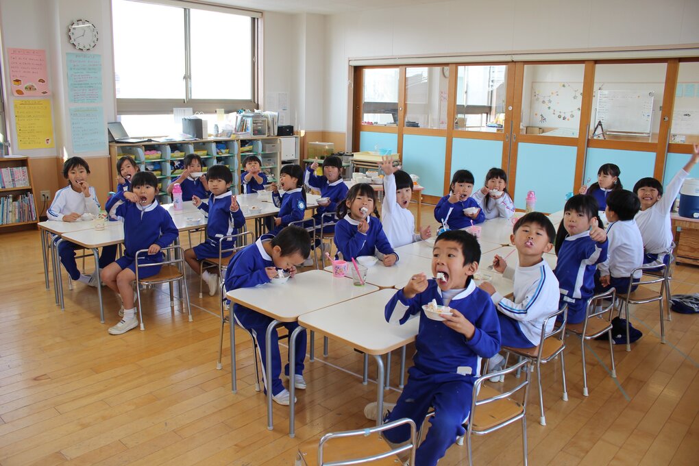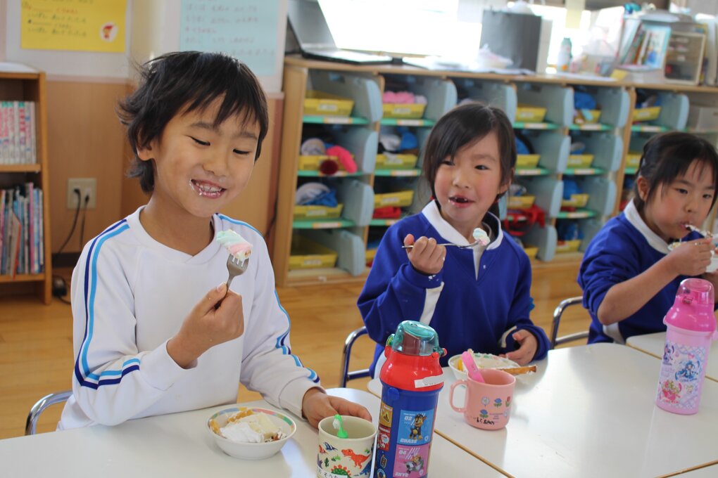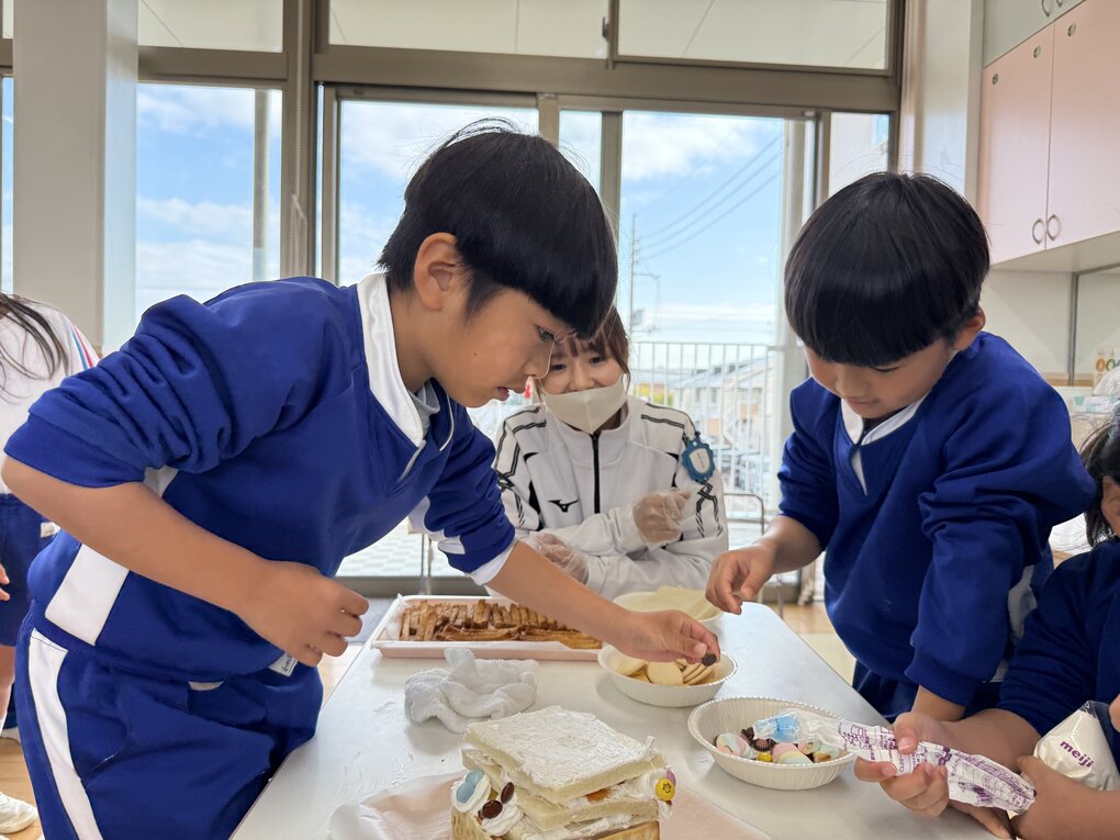 給食の後いよいよ実食。せっかくの家が崩れてしまって悲しむかも…と一瞬思いましたが、そんな心配は一切お構いナシ!好きなお菓子を選んで取り分けたお菓子の家をパクパクとあっという間に平らげ大満足の子ども達でした(中でもレインボーマシュマロが一番人気)。