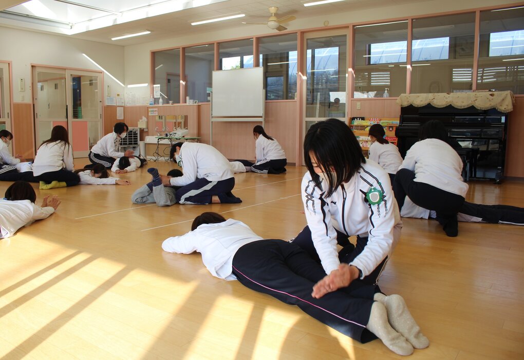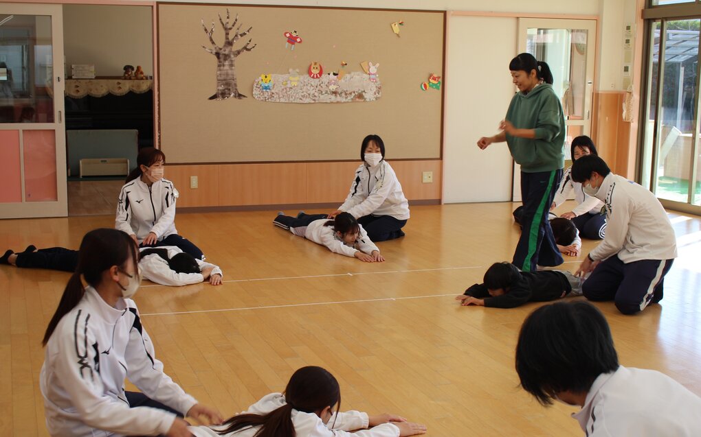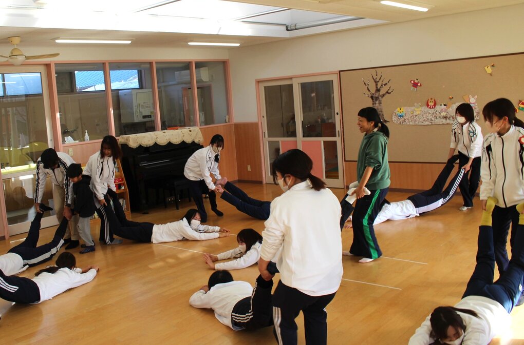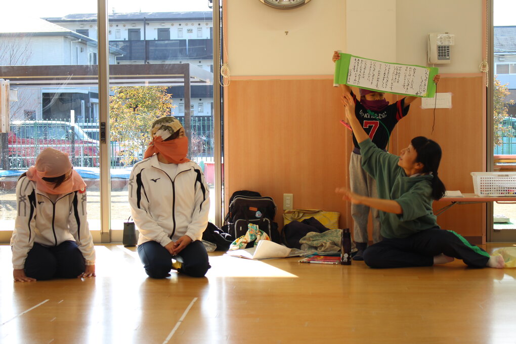 はじめに、2人組になって体を使った触れ合い遊び。互いの体をキュウリの漬物やトンカツに見立てて『相手のイタキモチイイ』を2人で体をゴロゴロ、トントンしながら探し合いっこ。こうした『他者に触る』体験をとおして相手のことをより知ったり、考えたり、思いやりのあるやりとりを楽しむことができます。