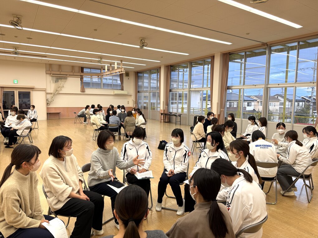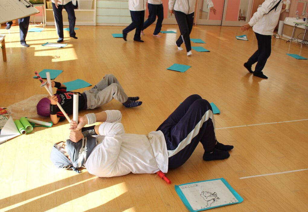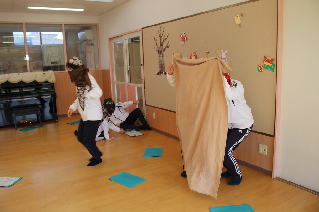 次に、子ども達が大好きな『忍者』になりきって大人も本気遊び。修行として、2人組で部屋中に配布したカードをかわしながらサササッーと走ったり、カードをめくってお題に沿った修行『すいとんの術や石垣登り等』に挑戦したり、最後は仲間と思っていた相手が実は敵だったことが分かり戦ったり…。その後の振り返りでは参加した職員から(年齢発達によっては)子どもはカードをかわしながら走るだけでも楽しいかも…や、カードの内容を自分達で考えても楽しいかも…などの意見が聞かれ、経験年数や性別を問わず充実した園内研修となりました。
