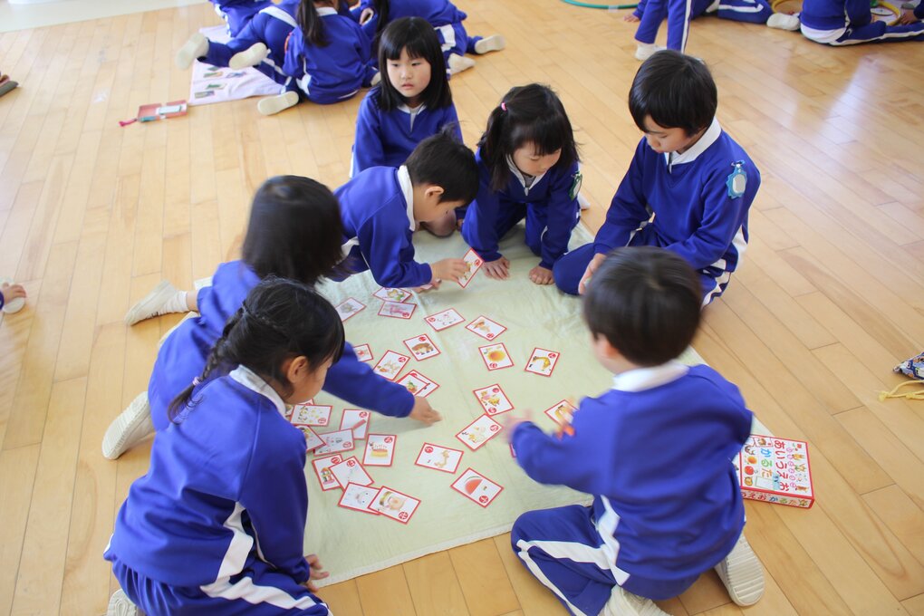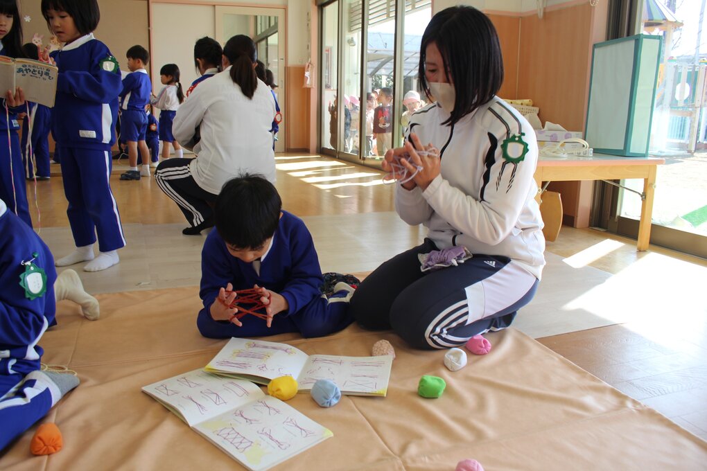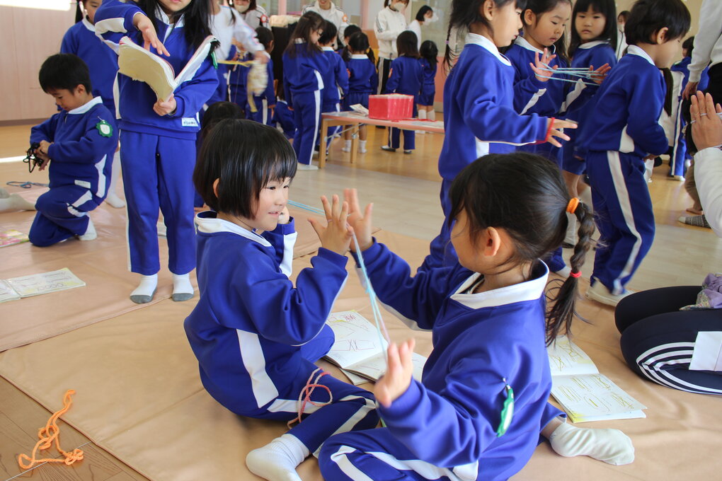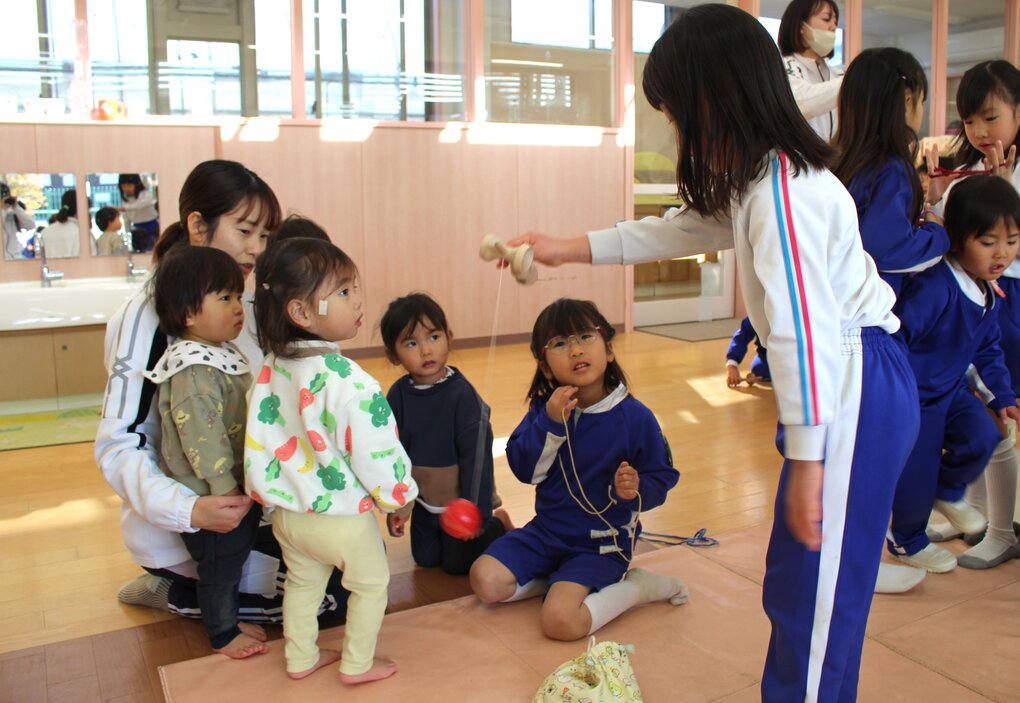 各クラスでカルタや糸引きゴマ、けん玉、あやとりなど様々な伝承遊びに親しんでいた子ども達。好きな会場(保育室)を回って遊ぶ時間では、自分の好きな伝承遊びを楽しんだり、年長児や友達の姿を見て、したことのない伝承遊びに挑戦したり、年齢に関係なく投げゴマ対決で真剣勝負を楽しんだりする姿が見られました。また、遊びを進めていく中で、子ども達から小さいお友達にやさしく教えてあげたり、保育者も交えて和気あいあいと遊んだりする姿も自然と増えていきました。