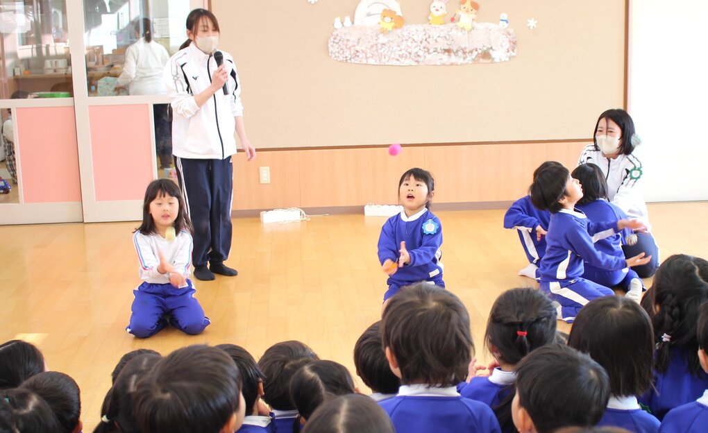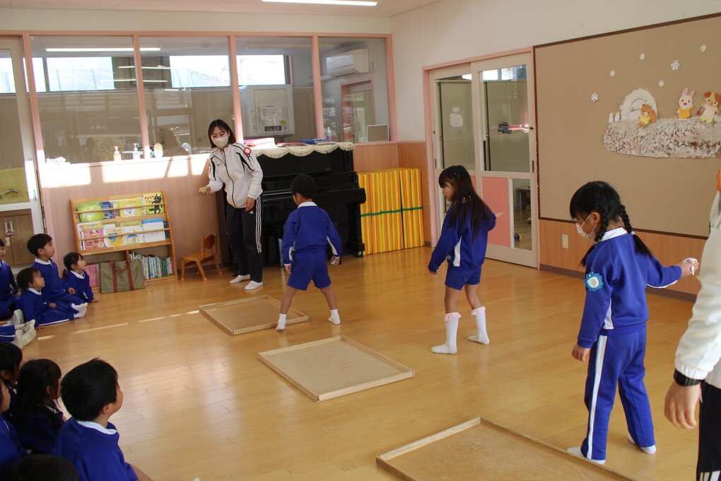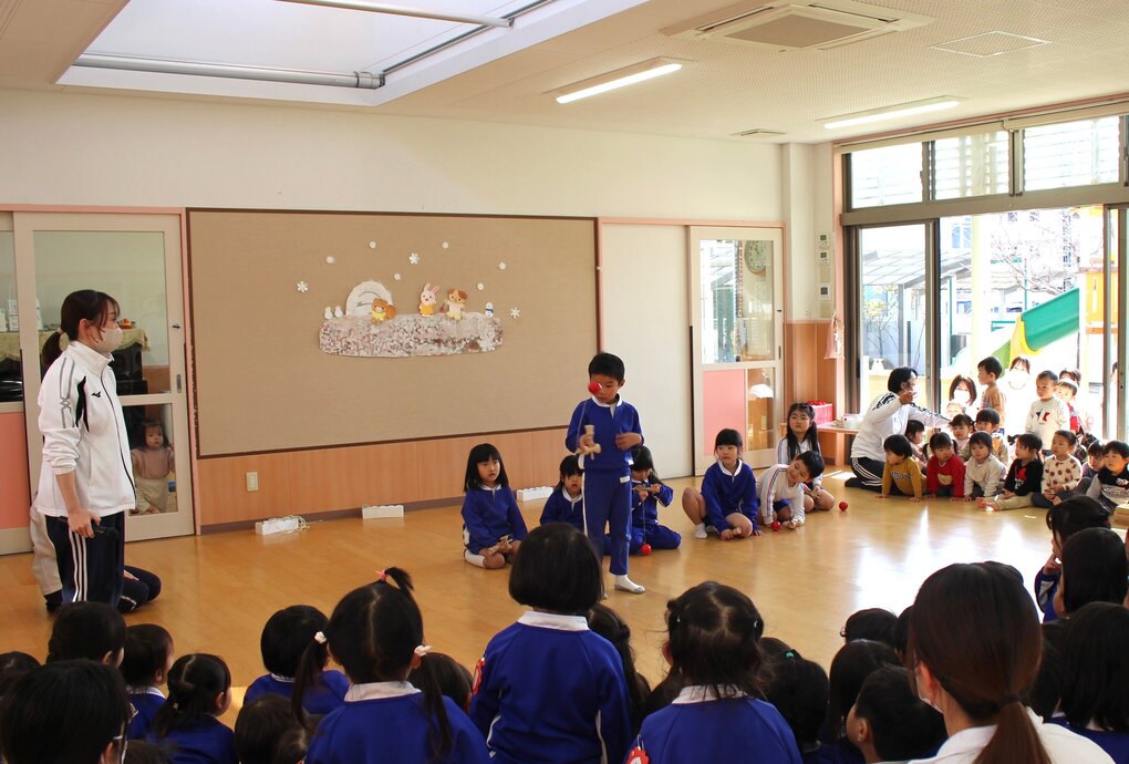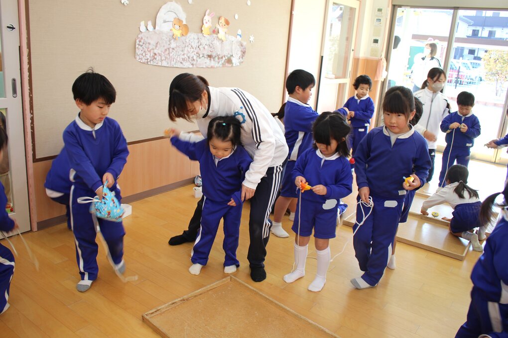 28日(水)、2~5歳児クラスで伝承遊び大会をしました。伝承遊びは大人から子どもへ、子どもから子どもへと時代を超えて受け継がれ、伝え合い、進化してきた日本の昔遊びです。この日の保育テーマは、年齢・性別に関係なく、教え合い、遊び合いながら「伝承遊びっておもしろい!」「次は○○をやってみよう」をもっと増やそう!としました。