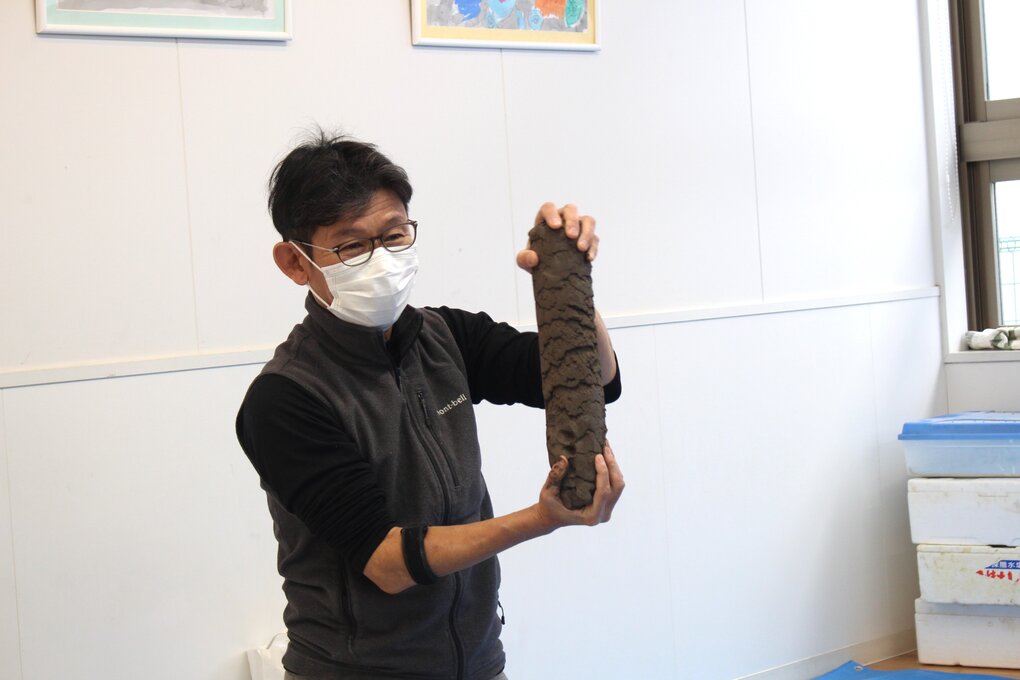 アトリエに集まった子ども達は、講師の十河先生から今回の作品作りに使う土粘土が夏に使った粘土を再生したモノであることを聞いてビックリ。半信半疑で一人一塊の粘土を手渡されるとその独特の匂いや色、質感が懐かしくもあり、心地よい感じでもあるようでした。