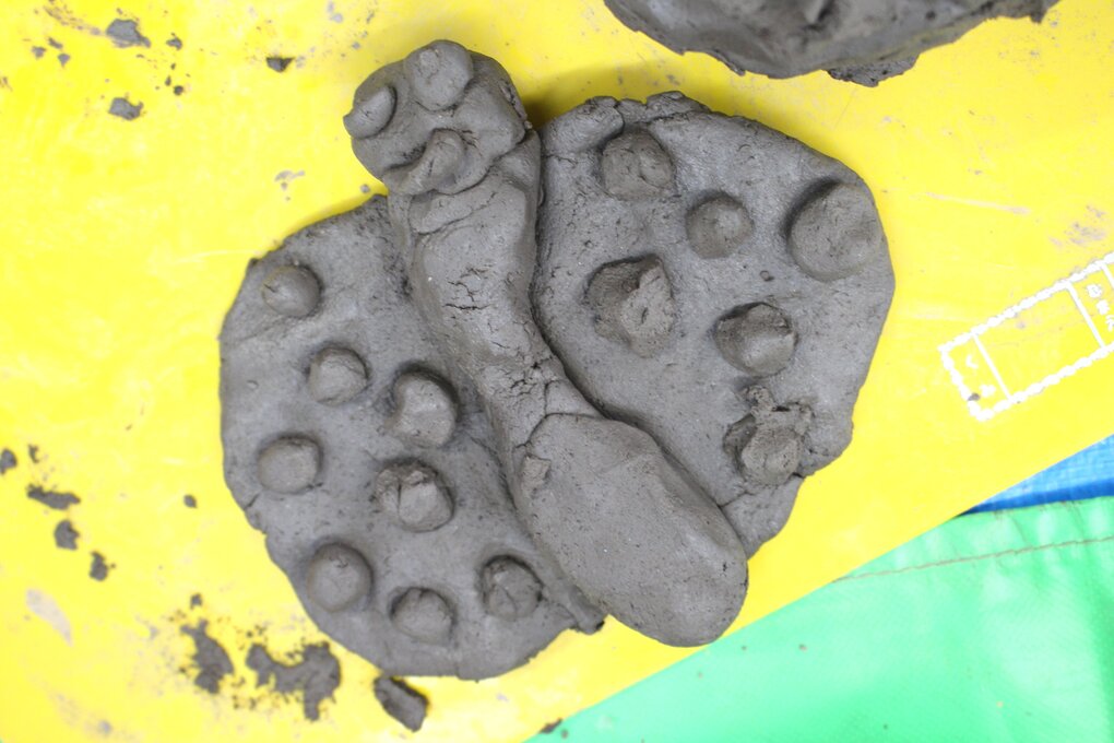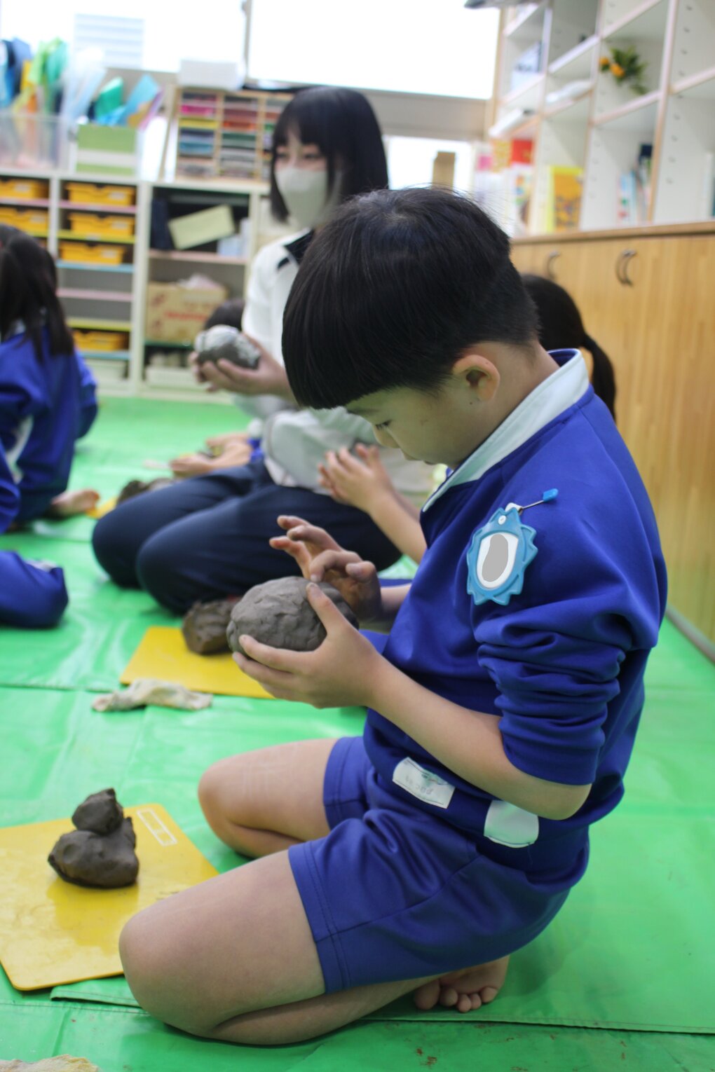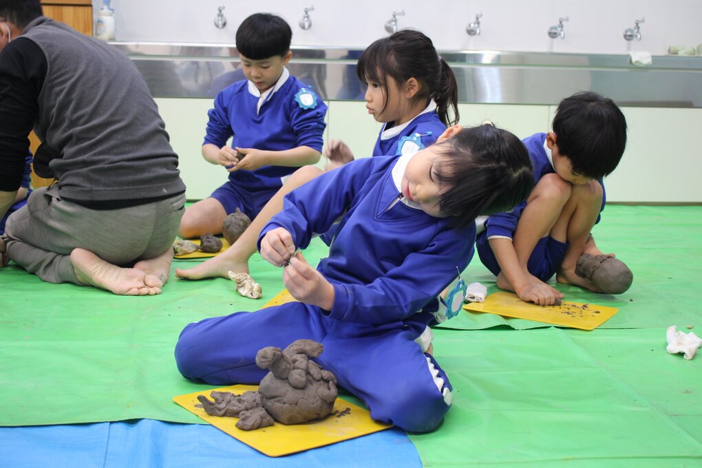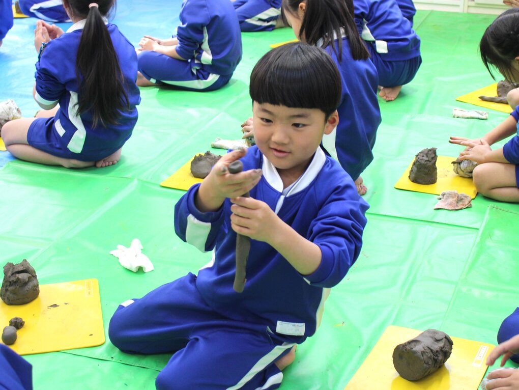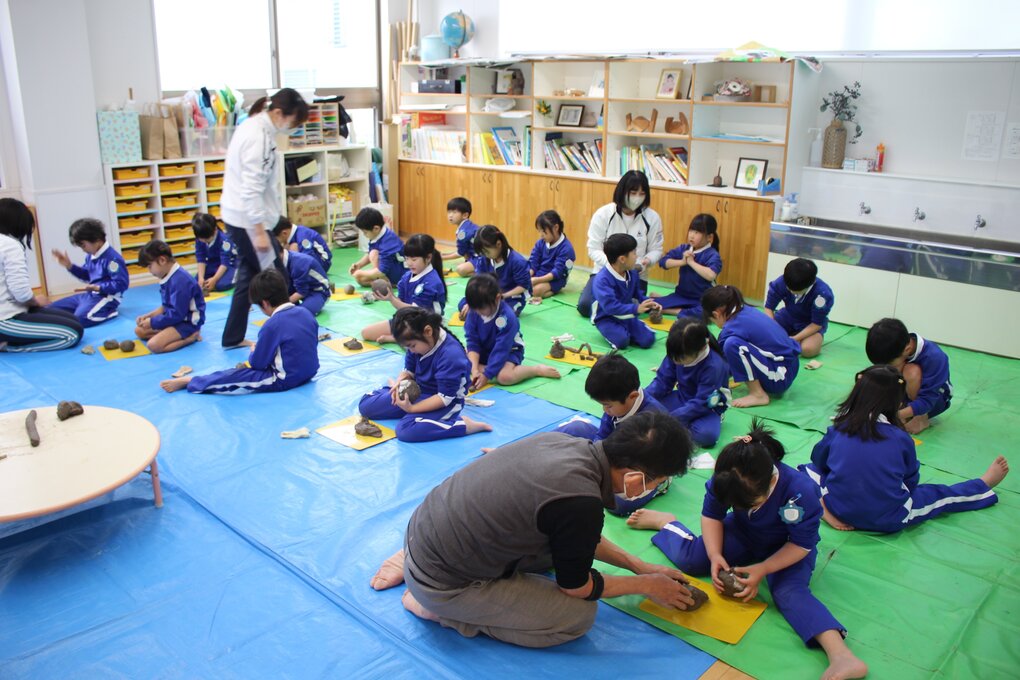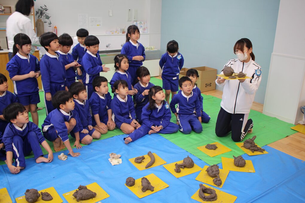 その後、完成した作品を皆で見合ったり、感想を発表したり、十河先生に質問したりして活動の振り返りを行いました。制作した作品は一度、十河先生の工房で素焼きにしていただき、2月中旬に園庭で皆で野焼きをして仕上げます。子ども達の手によって生まれた作品が、炎の力によってどのように色や質感の変化を遂げるのか、今から楽しみです。