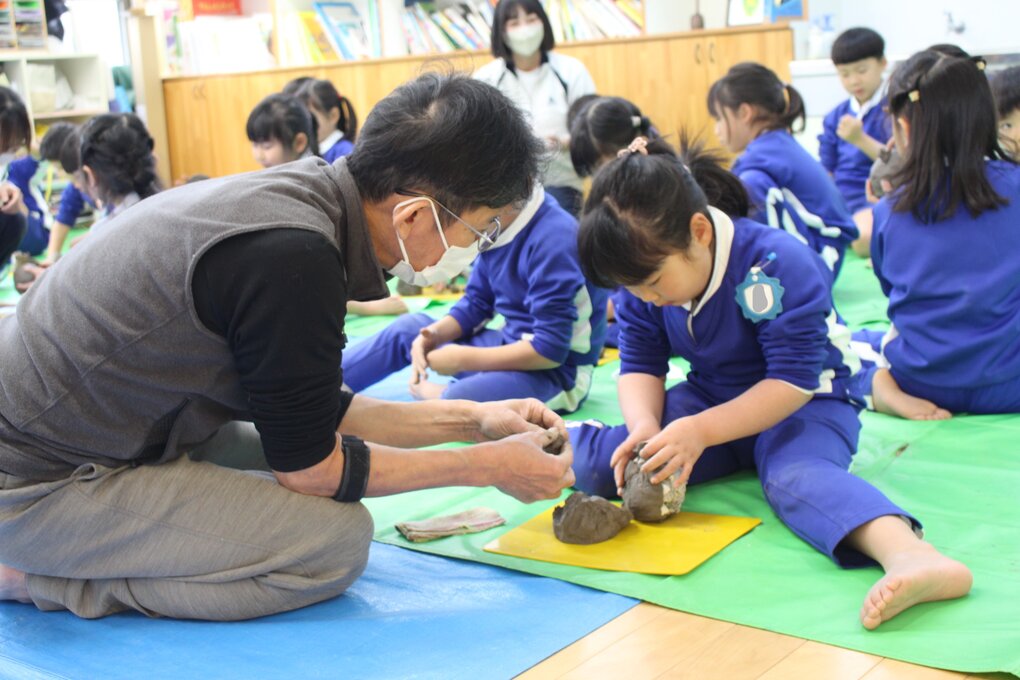 1月29日(木)、5歳児クラスの子ども達は土粘土を使った卒業制作の作品作りをしました。講師の先生は、玉野市在住の陶芸作家 十河隆史先生(T-POTTERY)です。子ども達は夏にも土粘土を使ったグループ制作をしているので土粘土に触れるのは今回で2回目です。
