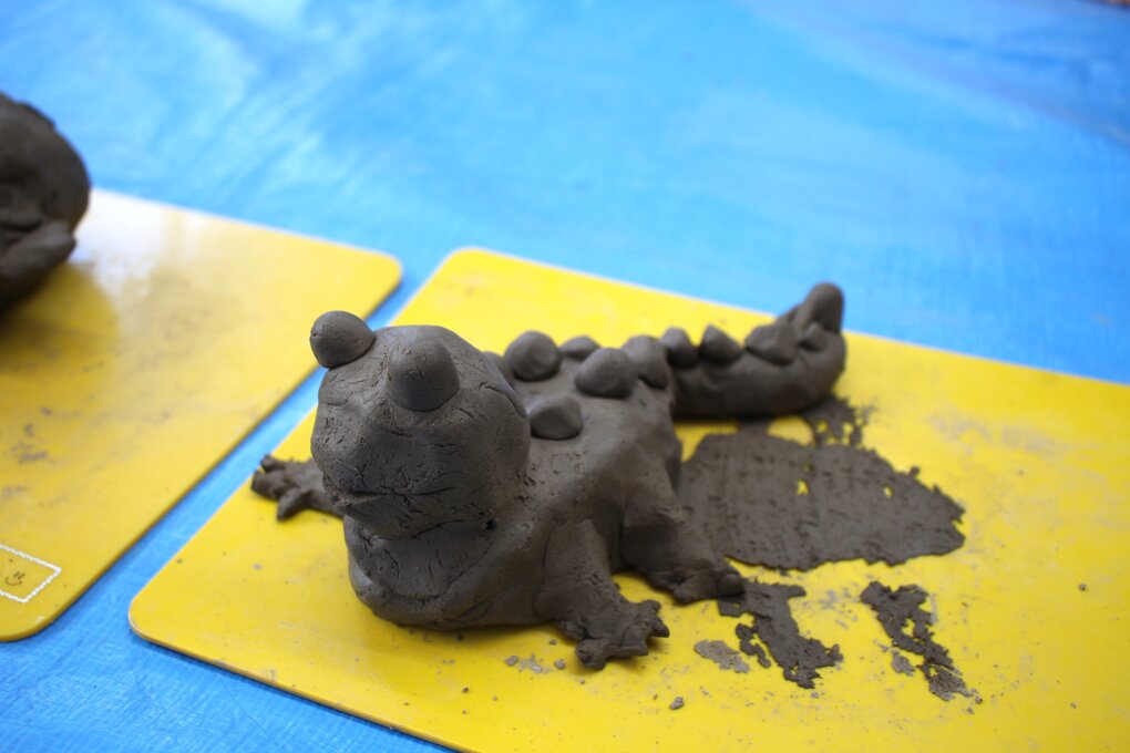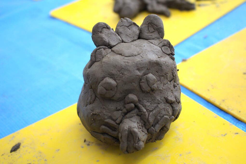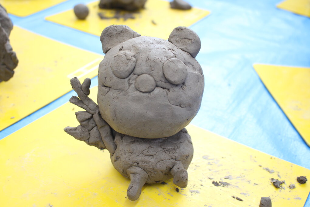 作品作りでは、事前に作りたいテーマを個々に決めていたので、どの子もすぐに作品作りに取り掛かりました。最初に新聞紙で作った芯に粘土をペタペタと貼っていきます。その後は、細かいパーツを作ったり、それを土台にくっつけたりしながら約30分間、土粘土との会話を楽しむように作品作りに没頭しました。