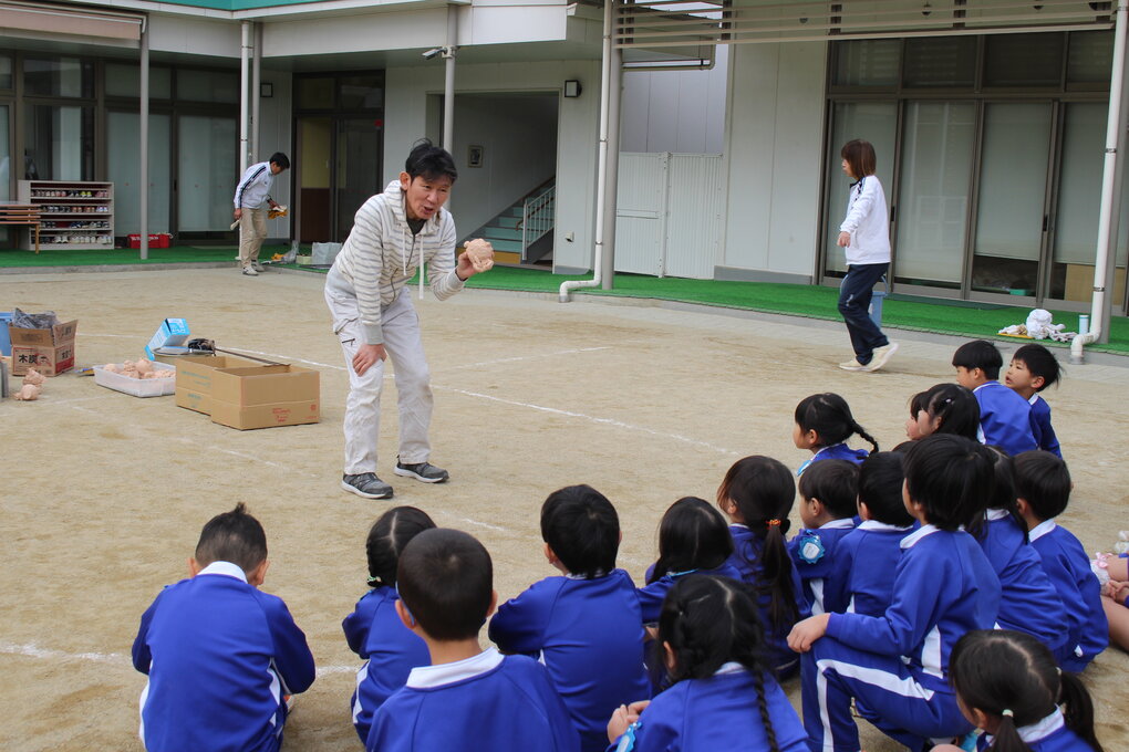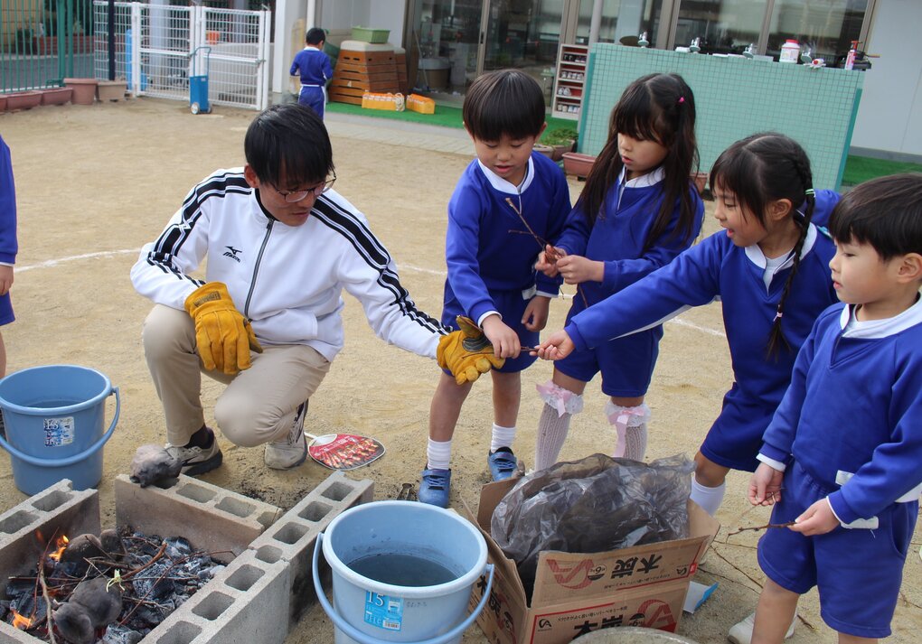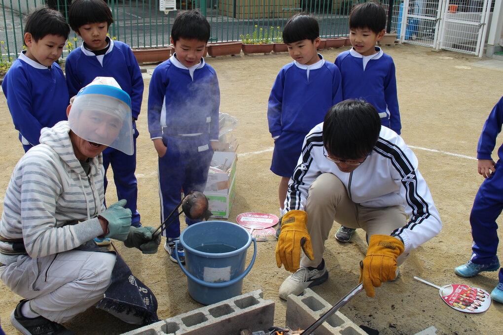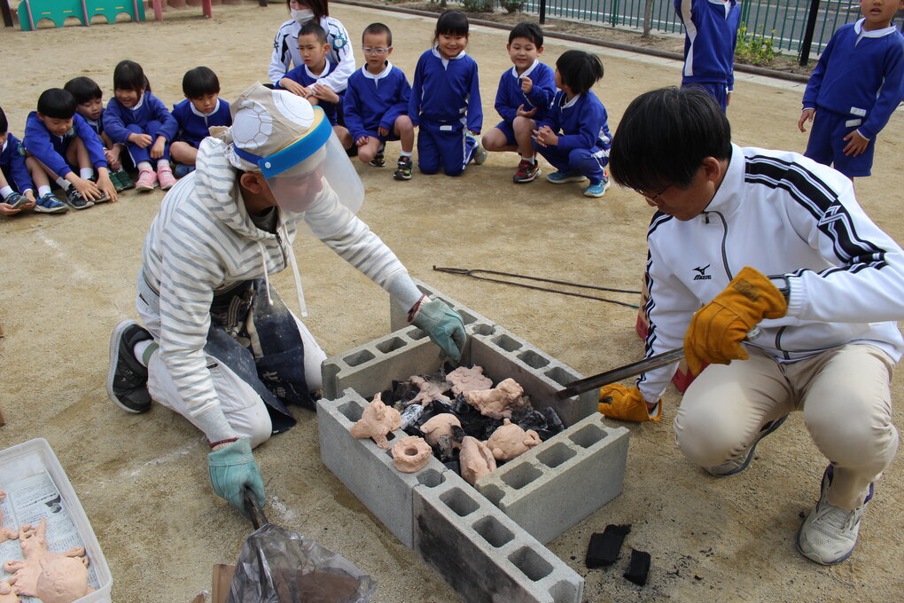 2月9日(月)、5歳児クラスの子ども達は土粘土を使った卒業制作①の続きとして園庭で野焼き体験をしました。講師の先生は①に引き続き玉野市在住の陶芸作家 十河隆史先生(T-POTTERY)です。