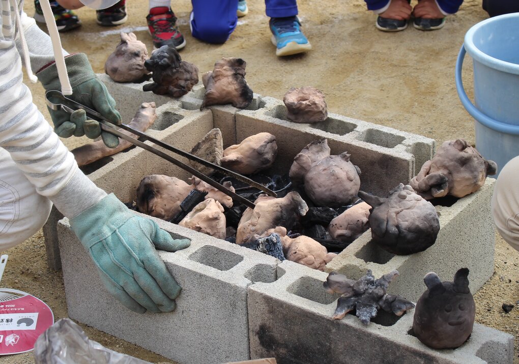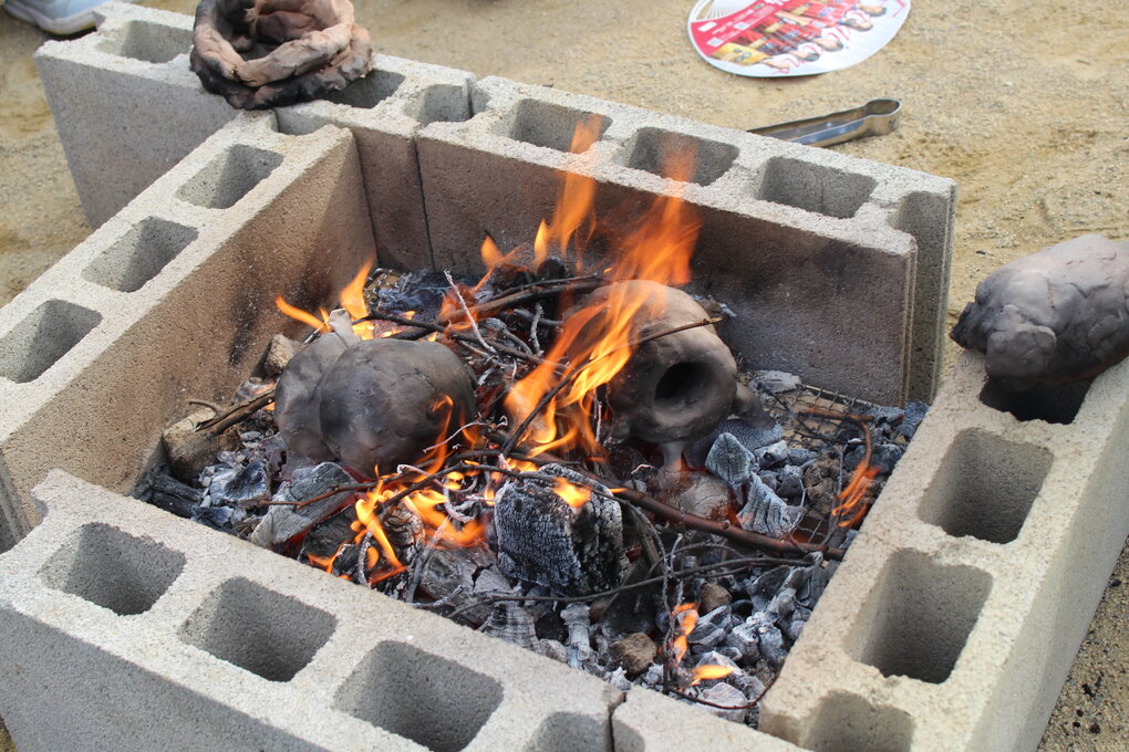 野焼きは事前の準備がとても重要で、大量の炭をあらかじめ作っておく必要があります。これが暑くて中々な重労働…。その炭をブロックと耐火煉瓦でつくった窯に敷きつめて、その中に十河先生の工房で一度素焼きしていただいた子ども達の作品を丁寧に窯の中に置いていきます。