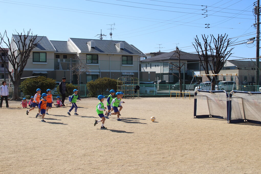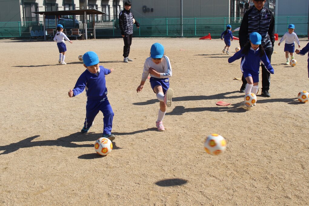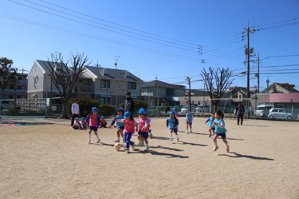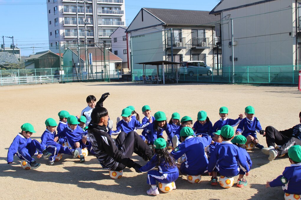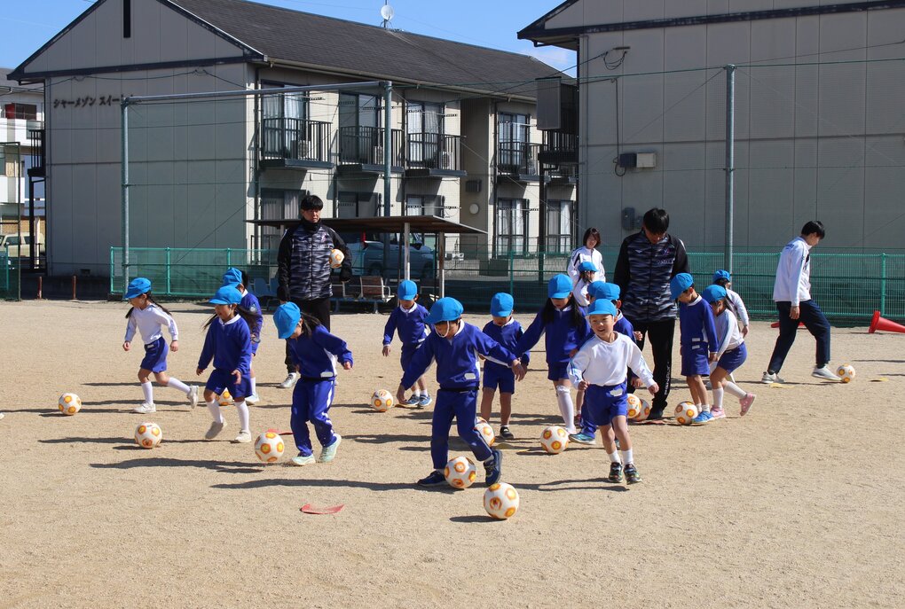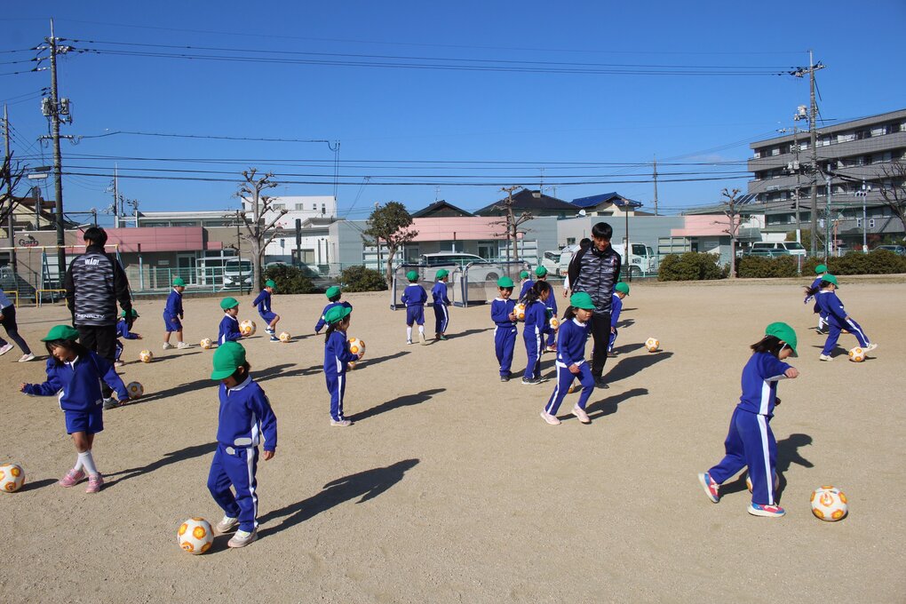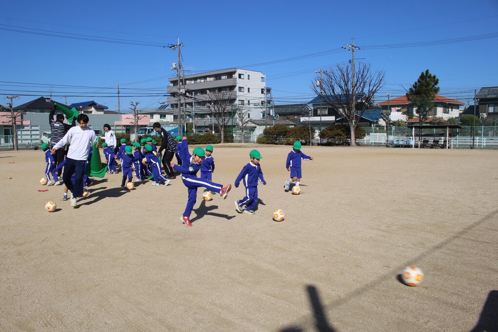 2月19日(木)、園近くの公園で、昨年見事J1に昇格したファジアーノ岡山のコーチに4・5歳児クラスを対象としたサッカースクール(1回目※全2回)を開催していただきました。(※晴れの国トップアスリート派遣事業)