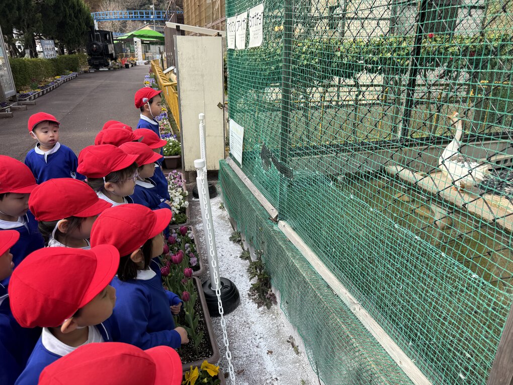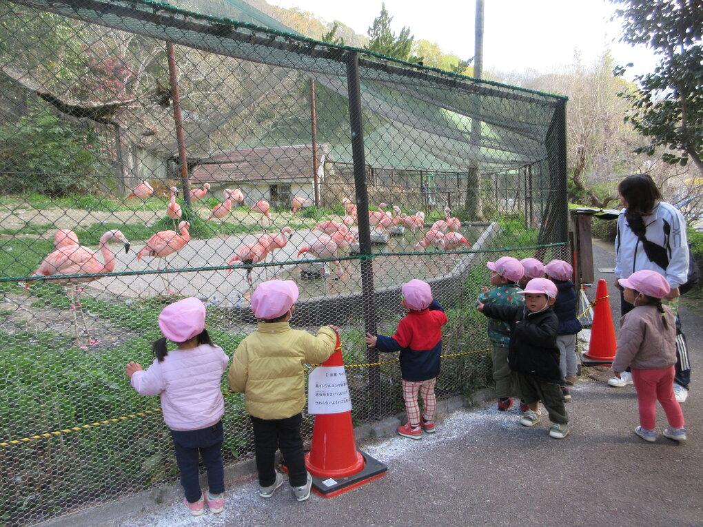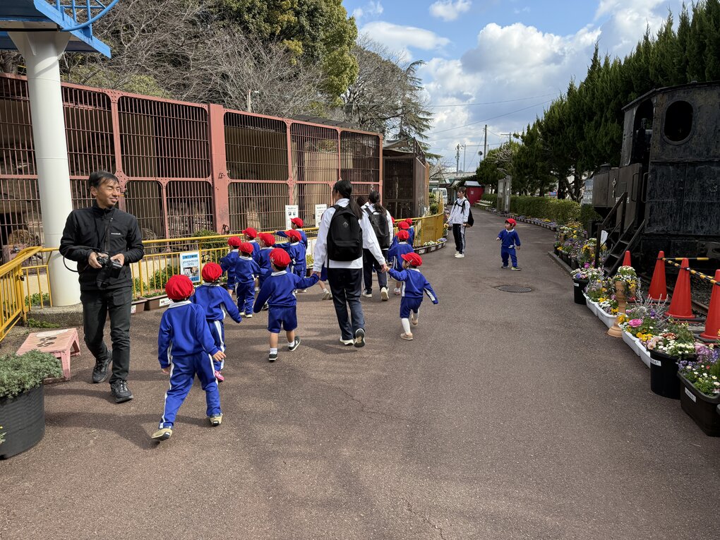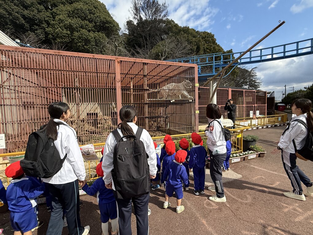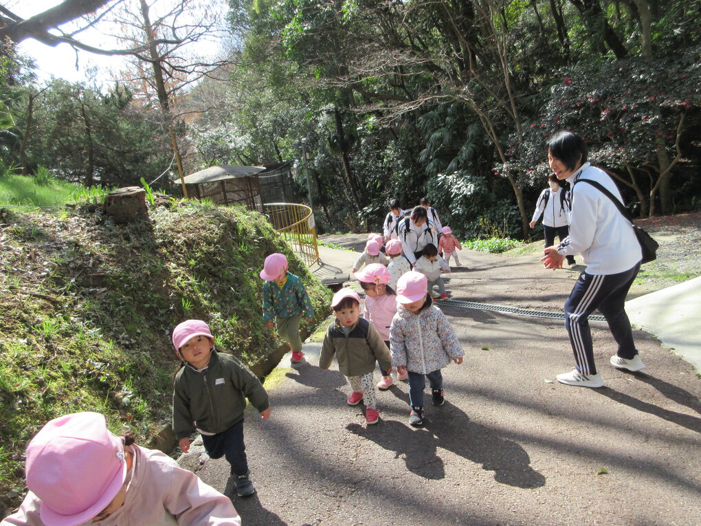 3月10日(火)気持ち良く晴れた朝、1・2歳児クラスの子ども達は池田動物園へ遠足に行きました。1歳児クラスの子ども達にとってははじめての遠足です。行きのバスから子ども達のワクワク感は高まる一方で、池田動物園が見えると「やったー(着いた)!」「動物さん(ホワイトタイガー?)見えた!」「起きてる!」と大興奮でした。それではいつものように1歳児クラスと2歳児クラスに分けて当日の様子を紹介します。