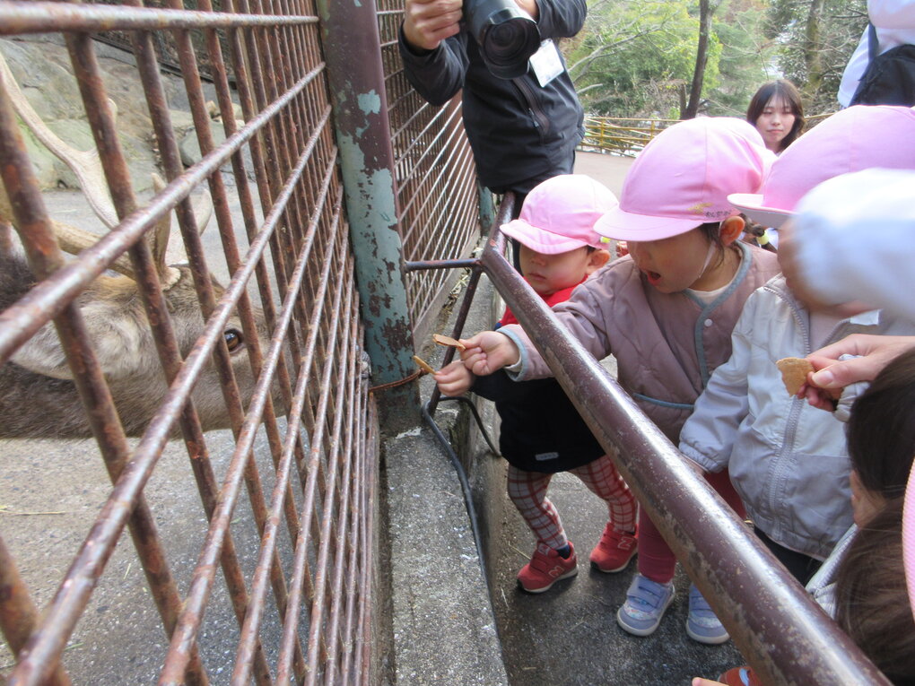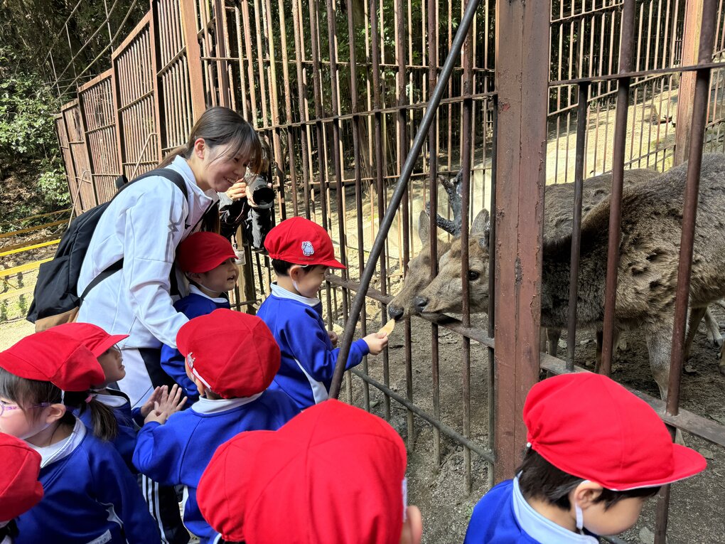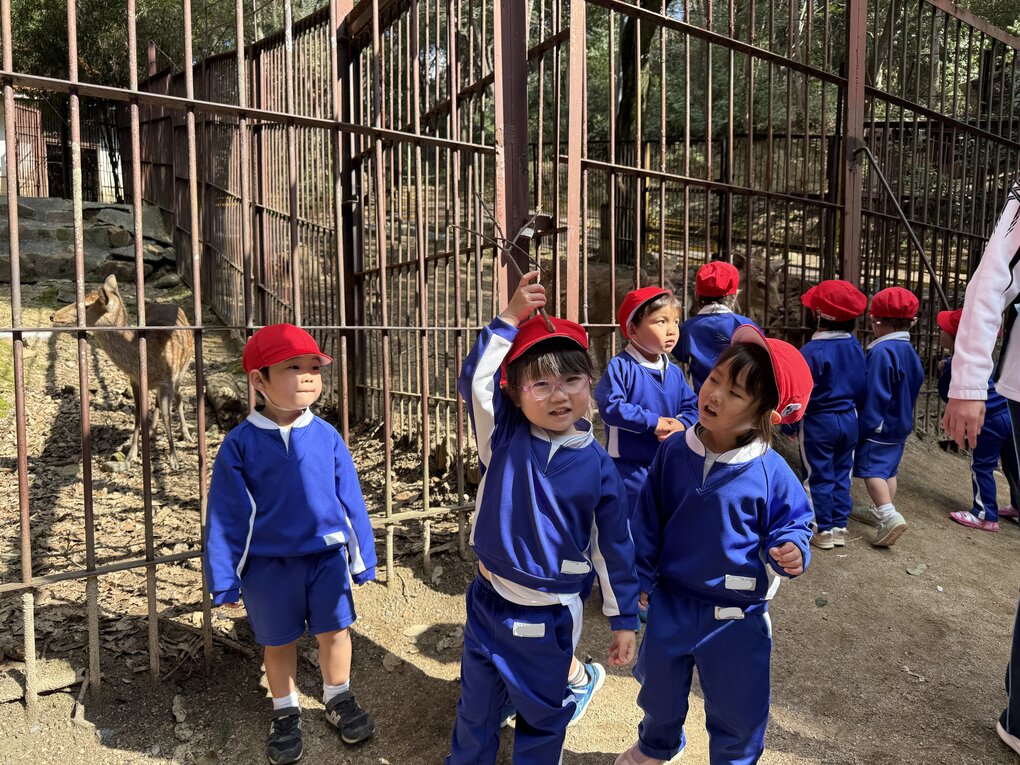 到着後、早速目に入ってきたキリンや動物たちの鳴き声が聞こえて大喜びの子ども達。園内を周り始めると早速「ホワイトタイガーだ!(この日は奇跡の瞬間に出会えました)」「あそこにはなにがいるの?」「今ご飯を食べてる!」と動物の動きや仕草、模様や大きさをじっくりと観察して友達や先生と共有しながら一緒に楽しみました。また、鹿のエサやり体験もできて「シカさん食べた!」「上手にあげれた!」と嬉しそうな姿がたくさん見られました。
