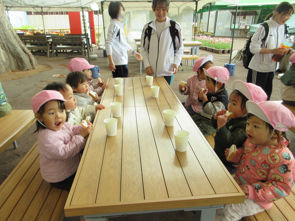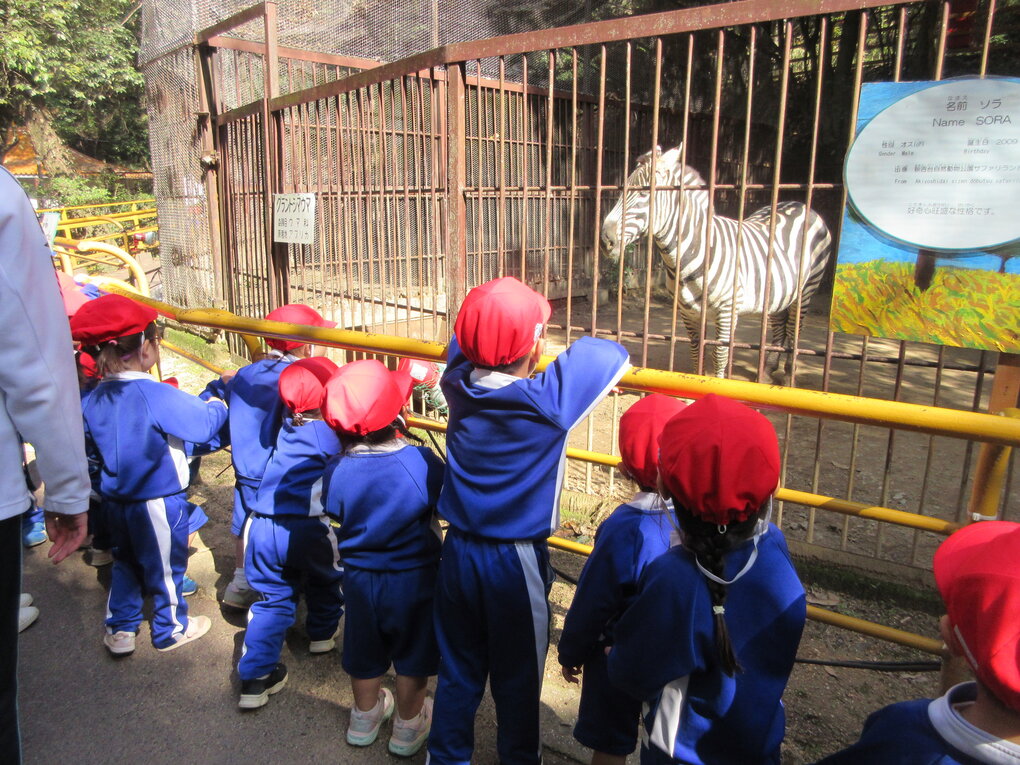 フラミンゴゾーンから急な坂道を自分の足でてくてく歩いて登り、全員で鹿にせんべいをあげることができました。下に降りてきてからはツキノワグマが棒で遊ぶ場面やホワイトタイガーが元気に動き回る姿なども間近で本物の動物たちを見れて大満足の子ども達。最後に大好きなキリンを見ながら給食先生が朝早くから作ってくれたジャムサンドも食べてひと休み。園内をぐるっと1周、子ども達には少し長いかな…と思うルートでしたが、全員自分の足でしっかり歩き、色々な動物の不思議に出会えた楽しい遠足となりました。