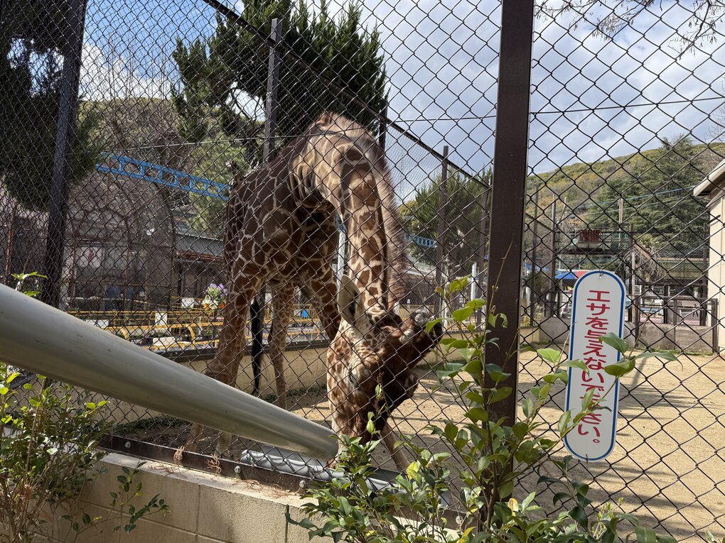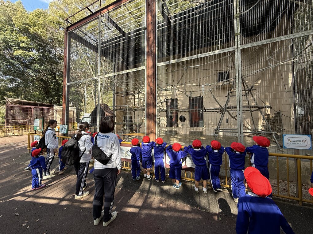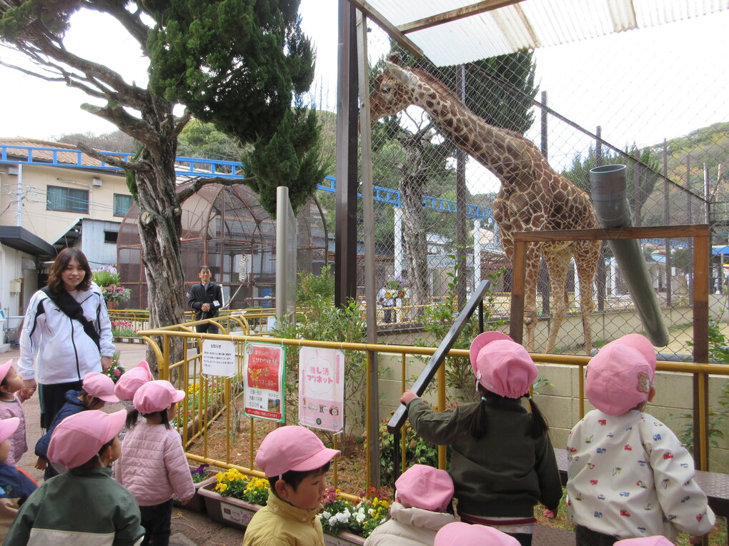 到着後、1歳児クラスの子ども達は一番楽しみにしていたキリン(サンタロウ)のところへ。大きなキリンに目を輝かせて見上げていた子ども達にサンタロウも近くまで来てくれてのファンサービスに大喜びの子ども達。キリンの後ろにいたテナガザルを見て次に行こうとしたそのとき、突然テナガザルが大きな声で鳴き始め、迫力のある鳴き声にビックリ!